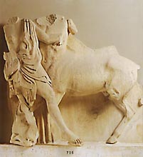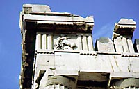 Στις μετόπες της ανατολικής πλευράς, οι οποίες σώζονταν μέχρι πριν από λίγα χρόνια πάνω στο μνημείο (σήμερα φυλάσσονται στο μουσείο), απεικονίζονται σκηνές Γιγαντομαχίας σύμφωνες με την περιγραφή του Απολλόδωρου. Δυστυχώς είναι κατεστραμμένες σε μεγάλο βαθμό και η αποκατάστασή τους βασίζεται στα περιγράμματα των μορφών. Η σύνθεση είναι κλειστή. Οι θεοί παριστάνονται σε μονομαχίες με γίγαντες. Ο Δίας, ο Ποσειδώνας και ο Απόλλωνας ακολουθούνται από άρματα, ενώ το άρμα του Ήλιου σημαίνει την τελική φάση της μάχης.