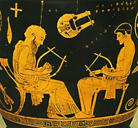 Η διδασκαλία της μουσικής περιλάμβανε χορό και την εκμάθηση μουσικών οργάνων, κυρίως κιθάρας και αυλού, η οποία ήταν συχνά εμπειρική και δεν προϋπέθετε τη χρήση παρτιτούρας. Δεν πρέπει βέβαια κάτι τέτοιο να ήταν δύσκολο, αφού η ελληνική μουσική δεν ήταν πολυφωνική. Στόχος της στοιχειώδους εκπαίδευσης ήταν να προετοιμάσει τους νέους, ανεξάρτητα από την κοινωνική τάξη στην οποία ανήκαν, για την εισαγωγή τους στην πολιτική και κοινωνική ζωή της πόλης. Η κλασική ηθική συνοψίζεται στη φράση "καλός καγαθός" (ωραίος και καλός) και υποδηλώνει τις κυρίαρχες αξίες της εποχής, τις οποίες καλούνταν οι νέοι να ενσαρκώσουν. |
