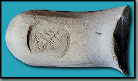 03. The handles of Rhodian amphorae, which have been found around the Mediterranean, reveal the island's trade relations with different regions in that area. Photo: sealed handle of a Rhodian amphora with a representation of Helios on his quadriga.