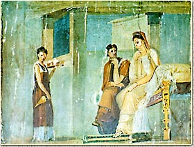 Wall-painting from Pompeii, with scene from the women's quarters. Two women are conversing, seated on an anaklintron; a female slave is coming up to them.
