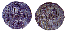 Αργυρό ημιβασιλικό του αυτοκράτορα Ιωάννη Στ' Καντακουζηνού (1353-4). Στον εμπροσθότυπο ο Χριστός ένθρονος και στον οπισθότυπο ο άγιος Δημήτριος (αριστερά) και ο Ιωάννης Στ' (δεξιά). Αθήνα, ιδιωτική συλλογή.