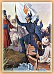 On 22 February 1821, Alexander Ypsilantis along with a small escort of five persons crossed the River Pruth, the boundary with Russia and the Danubian principalities (Moldavia and Wallachia) which belonged to the Ottoman Empire. In Moldavian territory the garrison of Prince Michael Soutsos was waiting for Ypsilantis and escorted him to Iasi. There, on 24 February he issued the proclamation 'Fight for Faith and Country', which is considered the official proclamation of the Greek Revolution. Two days later a religious ceremony was performed during which the flag of the revolution was blessed. On one was a phoenix, the main symbol of the Philiki Etaireia, and the phrase Reborn from my Ashes,