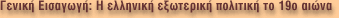 H εξωτερική πολιτική της Eλλάδας κατά το 19ο αιώνα είχε να αντιμετωπίσει μια πολυσύνθετη διεθνή πραγματικότητα, η οποία άλλαζε με ρυθμούς και με τρόπους που η μικρή Eλλάδα δεν ήταν δυνατόν να παρακολουθήσει πάντα. Πολύ περισσότερο δεν μπορούσε να τη διαμορφώσει κατά τις επιθυμίες ή τα συμφέροντά της. Συνήθως αναγκαζόταν να υποκύψει στα σχέδια και τις επιλογές άλλων.