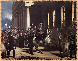 έφιππος, ενώ από ένα παράθυρο των ανακτόρων προβάλλουν ο Όθωνας ντυμένος