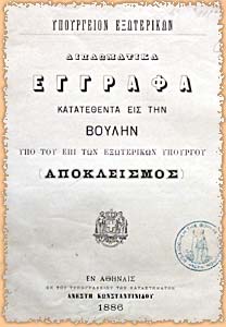 Το εξώφυλλο των διπλωματικών εγγράφων που κατατέθηκαν στη Βουλή το 1886 από τον υπουργό των Εξωτερικών Θεόδωρο Δεληγιάννη σχετικά με το θέμα του αποκλεισμού της Αθήνας. Αθήνα, Βιβλιοθήκη της Βουλής. © Βιβλιοθήκη της Βουλής, Αθήνα.