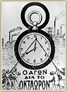 One of the most important initiatives of Venizelos' social policy was the introduction of the eight-hour working day. Cartoon depicting the struggle of the employed in claiming the above measure.