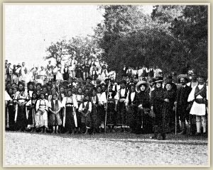 Sharecroppers and large estate owners at the end of threshing in 1904.