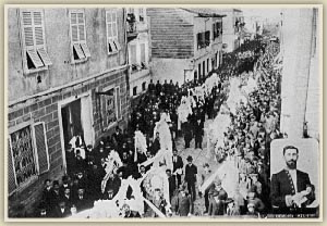 Φωτογραφία από την κηδεία του Θ. Ασκητή, ο οποίος υπήρξε πρώτος διερμηνέας του Προξενείου της Θεσσαλονίκης. Δολοφονήθηκε κατά το Μακεδονικό Αγώνα.