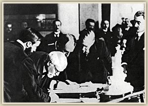 Ο Ελευθέριος Βενιζέλος υπογράφει τη Συνθήκη των Σεβρών στο Δημαρχείο της πόλης στις 28/10 Αυγούστου 1920.