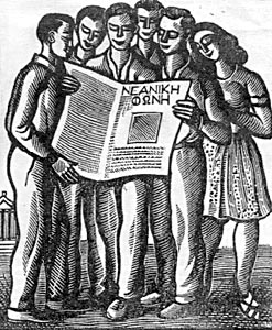 | Tassos Á. (1914-1985), Neaniki Phoni, 1943. Woodcut on upright wood 9,2 x 7,7 cm., first proof. © Feraldi-Xypolia Collection |