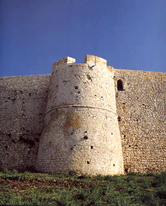 The castle of Chlemoutsi (Clermont, Castel Tornese) was the administrative centre of the principality of Achaia. On the picture, a semi-circular tower and part of the wall of the castle of Chlemoutsi.