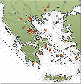 Οι πρώτοι οικισμοίΣτην αυγή της Νεολιθικής (Πρώιμη Νεολιθική, 6000 π.Χ.), η Θεσσαλία συγκεντρώνει το μεγαλύτερο πληθυσμό γεωργών, καθώς ένας μικρός αλλά σημαντικός αριθμός θέσεων ιδρύεται στην ανατολική και τη δυτική θεσσαλική πεδιάδα: Άργισσα, Αχχίλειο, Πρόδρομος, Πλατιά Μαγούλα Ζάρκου, Οτζάκι, Μεγάλη Βρύση Τυρνάβου. Αραιότερη είναι η εγκατάσταση στην ηπειρωτική και παράκτια χώρα του νότιου Αιγαίου (ο οικισμός των Αλών και της Ελάτειας στη Στερεά Ελλάδα, η Ακράτα στην Πελοπόννησο, η Κνωσός στην Κρήτη), όπου οι οικισμοί, χτισμένοι σε πεδινό και εύφορο έδαφος, δε βρίσκονται μακριά από τις ακτές. Στη Μακεδονία οι πρώιμες εγκαταστάσεις είναι περιορισμένες αλλά αυξάνονται από τη Μέση Νεολιθική και μετά (Νέα Νικομήδεια Βέροιας, Σέρβια). Οι Κυκλάδες δεν κατοικούνται στις πρώιμες περιόδους της Νεολιθικής. |