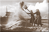 ΠαραγωγήΤα στάδια παραγωγής των πιο συχνά εμφανιζόμενων δημητριακών στους νεολιθικούς οικισμούς (μονόκοκκο και δίκοκκο σιτάρι και κριθάρι) περιλάμβαναν: όργωμα γης, σπορά, θερισμό, αλώνισμα, λίχνισμα και κοσκίνισμα του σπόρου. Η αναγνώριση αυτών των σταδίων παραγωγής στα αρχαιολογικά δεδομένα γίνεται με τη βοήθεια εθνογραφικών παραλλήλων (π.χ. τη μελέτη των καταλοίπων τροφής σύγχρονων αγροτικών κοινωνιών) και τη διαμόρφωση ορισμένων επιστημονικών συλλογισμών και προσδοκιών που αφορούν τα ποσοστά αντιπροσώπευσης των προϊόντων παραγωγής σε ένα αρχαιολογικό δείγμα. Η άροση της γης δε γινόταν με τα ζώα αλλά με το σκαλιστήρι. Η χρήση των ζώων για την άροση πιθανολογείται από τα τέλη της Νεολιθικής, αν και οι ενδείξεις πληθαίνουν από την Πρώιμη εποχή του Χαλκού και μετά. Παρόλο το μικρό μέγεθος των υπό καλλιέργεια γαιών, εικάζεται ότι η παραγωγή πλεονάσματος και η αποθήκευσή του θα κρίνονταν αναγκαία με σκοπό την εξασφάλιση πόρων σε περιόδους κακής σοδειάς. Η έλλειψη των ζώων ως βοηθητικών μέσων θα καθιστούσε το όργωμα μία χρονοβόρα διαδικασία. Αντίθετα η σπορά θα ήταν μία πολύ ευκολότερη διαδικασία. Η επιτυχία όμως της σποράς προϋπέθετε την κατοχή γνώσεων και εμπειρίας σε σχέση με την οικολογική συμπεριφορά των δημητριακών και οσπρίων (ταίριασμα ποικιλιών, μεταφορά σπόρων, φύτευση, συχνότητα ποτίσματος και ξεβοτανίσματος, τρόποι εμπλουτισμού εδάφους μέσω των λιπασμάτων κ.ά.). Τέλος, η επιλογή τύπου καλλιέργειας (μεικτή ή εναλλακτική καλλιέργεια οσπρίων και δημητριακών) εξαρτιόταν από τις υπάρχουσες κλιματολογικές συνθήκες και τις συνθήκες εδάφους. Ο θερισμός γινόταν με ξύλινα ή οστέινα δρεπάνια, στα οποία είχαν προσαρμοστεί σειρές κοφτερών λίθινων λεπίδων από πυριτόλιθο. Σήμερα, κατά το θερισμό σχηματίζονται μεγάλα δεμάτια από στάχυα που προορίζονται για αλώνισμα, διαδικασία δηλαδή κατά την οποία ξεχωρίζουν τον καρπό από το άχυρο. Δεν έχουν αναγνωριστεί ειδικοί χώροι αλωνίσματος (αλώνια) σε ανασκαμμένες θέσεις της νεολιθικής Θεσσαλίας, ούτε γνωρίζουμε τον ακριβή τρόπο αλωνίσματος (με δοκάνες ή με ζώα). Σήμερα, αφού χωριστεί ο καρπός, τον μαζεύουν με ό,τι άλλο απέμεινε στο χώρο του αλωνίσματος (λέπυρα, ζιζάνια) και τον στοιβάζουν για να ακολουθήσει το λίχνισμα. Κατά το λίχνισμα, που γίνεται κυρίως στα γυμνά σιτηρά (κοινό και σκληρό σιτάρι), ανακινούν τον καρπό πετώντας τον ψηλά με σκοπό να ξεχωρίσουν τον καθαρό καρπό από τα ραχίδια. Στα ντυμένα σιτηρά (μονόκοκκο, δίκοκκο σιτάρι η διαδικασία απομάκρυνσης γίνεται με το κοπάνισμα και το λίχνισμα των σταχιδίων. Τέλος, με χονδρό κοσκίνισμα απομακρύνουν τον καθαρό σπόρο από τα ζιζάνια και τα ραχίδια, ενώ με το λεπτό κοσκίνισμα επιτυγχάνεται ο ολοκληρωτικός καθαρισμός του σπόρου από τα τελευταία ζιζάνια. Παρόμοιες φαίνεται πως ήταν και οι δραστηριότητες καθαρισμού του σπόρου στη Nεολιθική εποχή. |