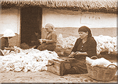 ΠαραγωγήΤα στάδια παραγωγής του υφαντού είναι η πρόσκτηση της πρώτης ύλης (λινάρι, μαλλί), η κατεργασία της ίνας σε κλωστή, η ύφανση, η βαφή και η συντήρηση του προϊόντος. Αρχαιολογικές ενδείξεις δεν υπάρχουν για όλα αυτά τα στάδια παραγωγής. Είναι όμως δυνατόν να ανασκευάσουμε την αλυσίδα παραγωγής από πληροφορίες που μας παρέχουν οι ιστορικοί χρόνοι και τα εθνογραφικά παράλληλα. Το λινάρι εξασφαλίζεται με την καλλιέργεια, αν και δεν αποκλείεται το λινάρι που χρησιμοποιήθηκε ως κλωστική ίνα στη Nεολιθική εποχή να μην είχε καλλιεργηθεί. Αφού ξεριζωθούν τα φυτά λίνου, δένονται σε δεμάτια και αφήνονται να ξεραθούν στον ήλιο. Κατόπιν τα δεμάτια τινάζονται για να πέσει ο λιναρόσπορος, μουσκεύονται για ένα ορισμένο διάστημα 10-15 ημερών μέσα στο νερό, ώστε να σαπίσει το ξυλώδες μέρος του στελέχους και λιάζονται για να στεγνώσουν. Ακολουθεί μία αρκετά επίπονη διαδικασία, η απομάκρυνση των ινών με τη βοήθεια ενός ξύλινου εργαλείου, το λανάρισμα και η ύφανση. Αντίστοιχες πληροφορίες για τον τρόπο πρόσκτησης και επεξεργασίας του μαλλιού από τα έρια δεν υπάρχουν από τους ανασκαμμένους νεολιθικούς οικισμούς. Από εθνογραφικά παράλληλα, όμως, γνωρίζουμε ότι τα πρώτα στάδια παραγωγής είναι το κούρεμα των ερίων (ο κούρος ή ο τιλμός), το πλύσιμο και το ξάσιμο των ινών. Κατά το κούρεμα, απομακρύνουν τις τρίχες με μεγάλα χτένια. Κατόπιν τις μαζεύουν, πιθανώς υπό μορφή πόκων (τυλιγμένων σε μπάλες), και τους πλένουν σε ζεστό νερό για να απομακρυνθούν τα λίπη. Έπειτα γίνεται το ξάσιμο των ινών, μία μακροχρόνια διαδικασία που αποσκοπεί στην απομάκρυνση των ακαθαρσιών και στο ξεχώρισμα των μπλεγμένων ινών. Aκολουθεί το γνέσιμο και η ύφανση, δύο από τις πιο σημαντικές και μακροχρόνιες φάσεις της υφαντουργίας. Κατά το γνέσιμο, με τη βοήθεια περιστροφικής κίνησης συνέχονται και σταθεροποιούνται οι μεμονωμένες ίνες. Το γνέσιμο γίνεται με το αδράχτι, ένα ραβδί που φέρει ένα βαρίδι στο κάτω μέρος του, το σφονδύλι, και που περιστρέφεται κατά τη φορά που του δίνει η ανθρώπινη κίνηση. Τα άφθονα σφονδύλια, συνήθως από πηλό αλλά και από πέτρα και οστό, που βρίσκονται σε όλους τους οικισμούς από τις αρχές της Nεολιθικής αποτελούν ασφαλείς μάρτυρες της ενασχόλησης με το γνέσιμο κατά την περίοδο αυτή. Η ύφανση αποτελούσε το στάδιο μορφοποίησης των κλωστών σε ύφασμα. Η άσκησή της προϋποθέτει την κατοχή ανεπτυγμένων δεξιοτήτων και γνώσεων. Οι μέθοδοι ύφανσης που εφαρμόζονται στη Nεολιθική ήταν η απλή (μονή διαπλοκή ενός στημονιού και ενός υφαδιού) και η διαγώνια (διαπλοκή δύο στημονιών και δύο υφαδιών). Ακολουθούσε τέλος η βαφή των υφαντών, που προϋπέθετε την κατοχή γνώσεων βοτανικής αλλά και την εξοικείωση με το περιβάλλον, αφού τα χρώματα προέρχονταν κυρίως από φυτικές ίνες. |