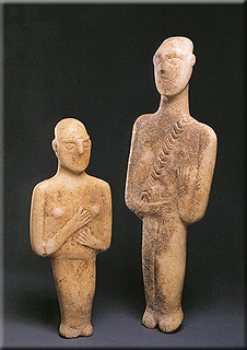Γυναικείο και ανδρικό ειδώλιο (κυνηγού;) από μάρμαρο. Πρωτοκυκλαδική II περίοδος. Αθήνα, Μουσείο Κυκλαδικής Τέχνης 312, 308. Ίδρυμα Ν.Π. Γουλανδρή-Μουσείο Κυκλαδικής Τέχνης (κάρτα). © ΥΠΠΟ