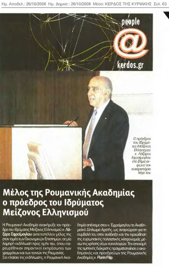 Μέλος της Ρουμανικής Ακαδημίας ο πρόεδρος του Ιδρύματος Μείζονος Ελληνισμού