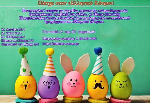 Για 5 ημέρες (Μ. Δευτέρα 22/4, Μ. Τρίτη 23/4, Μ. Τετάρτη 24/4, Πέμπτη του Πάσχα 2/5 και Παρασκευή του Πάσχα 3/5) γιορτάζουμε το Πάσχα με ένα πλούσιο εκπαιδευτικό πρόγραμμα που θα συναρπάσει τα παιδιά Α’ εως ΣΤ’ Δημοτικού. Παιχνίδια, κατασκευές και πολυαισθητηριακές δραστηριότητες μας φέρνουν κοντά στα έθιμα του τόπου και την καλύτερη εποχή του χρόνου, την Άνοιξη!