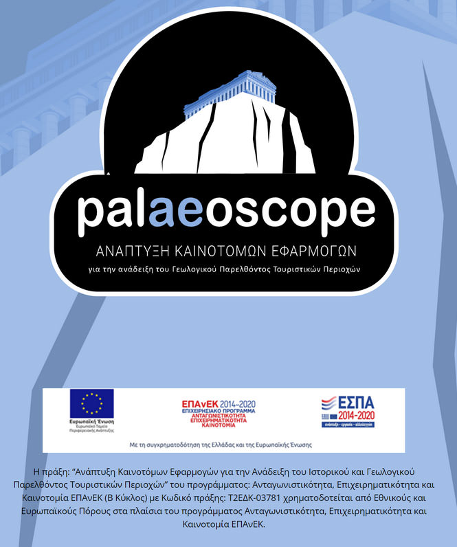 Το έργο στοχεύει στην ανάπτυξη ενός καινοτόμου τεχνολογικού προϊόντος περιήγησης πολιτιστικού και επιστημονικού περιεχομένου, στην παραγωγή νέας γνώσης, αριστείας και δημιουργία νέων θέσεων εργασίας. Υλοποιήθηκε με τη συνεργασία του Τμήματος Γεωλογίας και Γεωπεριβάλλοντος του Εθνικού και Καποδιστριακού Πανεπιστημίου Αθηνών, της InDigital, η οποία εξειδικεύεται στον σχεδιασμό και στην ανάπτυξη νέων τεχνολογιών και του Ιδρύματος Μείζονος Ελληνισμού, το οποίο προσφέρει τις ιδανικές συνθήκες για την διεξαγωγή συνεδρίων, πολιτιστικών, και επιστημονικών εκθέσεων. Αντικείμενο της πρότασης είναι η ανάπτυξη καινοτόμων εφαρμογών για τη συλλογή και ενσωμάτωση σύνθετων επιστημονικών δεδομένων προκειμένου αυτά να παρουσιαστούν με έναν εύληπτο τρόπο στους επισκέπτες περιοχών τουριστικού ενδιαφέροντος, υπό την μορφή αναπαραστάσεων του παρελθόντος και μέσω της εφαρμογής τεχνολογιών εικονικής και επαυξημένης πραγματικότητας. Για τις ανάγκες του έργου, έχει επιλεχθεί η μελέτη και αξιοποίηση της γεωλογικής, παλαιοντολογικής και ιστορικής εξέλιξης της πόλεως των Αθηνών. Το PalaeoScope θα αναδείξει πτυχές της φυσικής και της ιστορικής εξέλιξης της περιοχής, οι οποίες δεν γίνονται αντιληπτές παρά μόνο με την χρήση των προτεινόμενων τεχνολογιών, όπου ένας αριθμός επιστημονικών δεδομένων θα ενταχθεί μέσα στο φυσικό χώρο περιήγησης.
