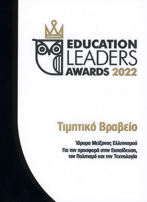 Τιμητικό Βραβείο στην 7η Τελετή Απονομής των Education Leaders Awards 2022 προς το Ίδρυμα Μείζονος Ελληνισμού για την προσφορά του στην εκπαίδευση, τον πολιτισμό και την τεχνολογία (3 Ιουνίου 2022)