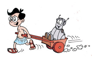 O Ηρακλής έχει αδυναμία στους στροβίλους, δηλαδή στις σβούρες. Έχει ολόκληρη συλλογή από ξύλινες και μεταλλικές, μικρές και μεγάλες και μία σχεδόν στο μπόι του! Τα παιδιά στην Αρχαιότητα χρησιμοποιούσαν ένα μικρό μαστίγιο για να τις κάνουν να στροβιλίζονται. Φυσικά, κέρδιζε εκείνος που η σβούρα του γύριζε περισσότερη ώρα από των άλλων. Όταν ο φίλος μας βαριέται τη σβούρα, του αρέσει να κυλάει το χάλκινο τροχό του, δηλαδή το "τσέρκι", ή το στεφάνι, όπως το λέμε σήμερα. Αλλά, αν και Ηρακλής, έχει το όνομα αλλά όχι και τη χάρη: είναι λίγο μπουνταλάς ο καημένος και όλο το κυνηγάει λαχανιάζοντας στην κατηφόρα! |
