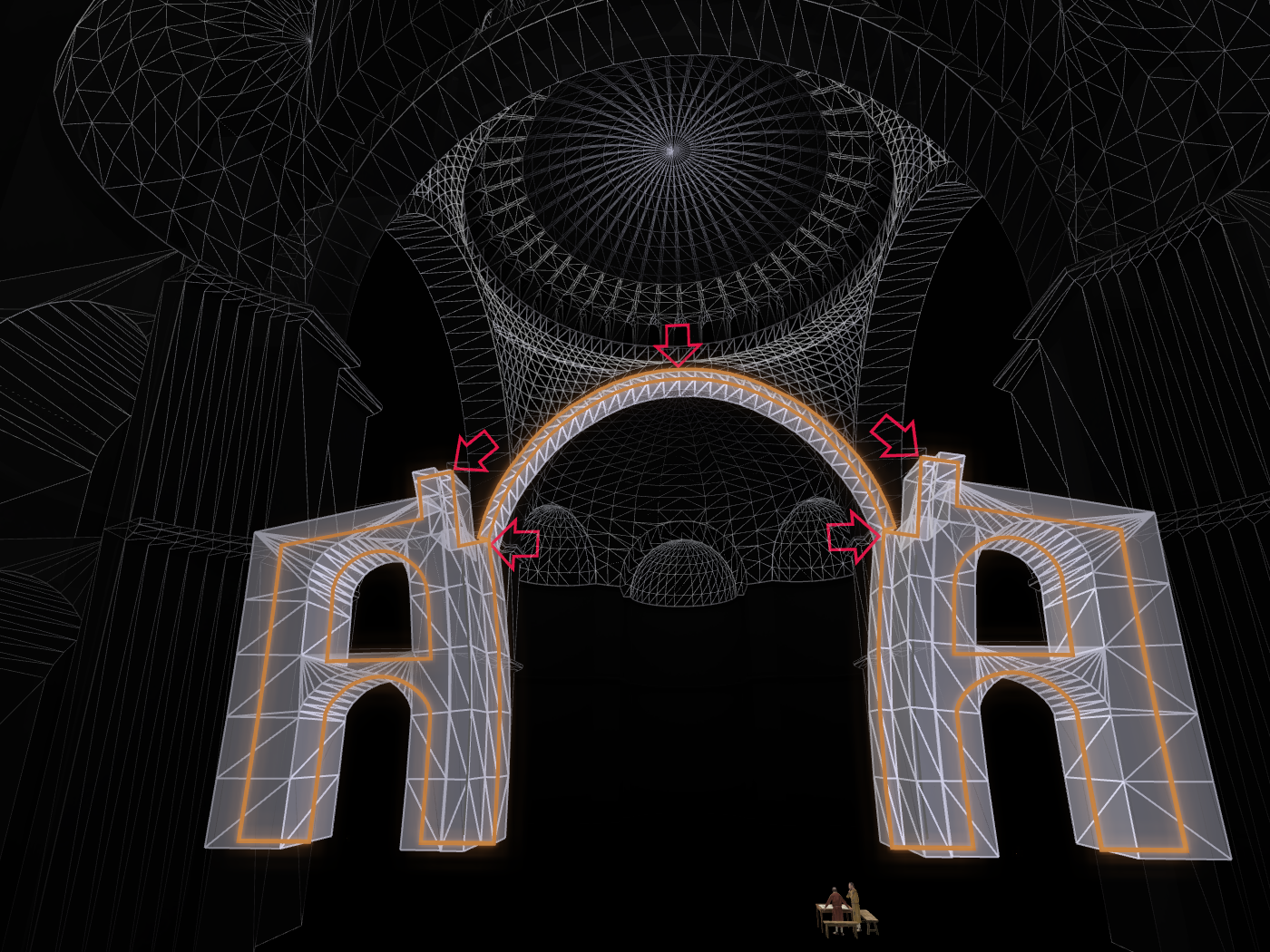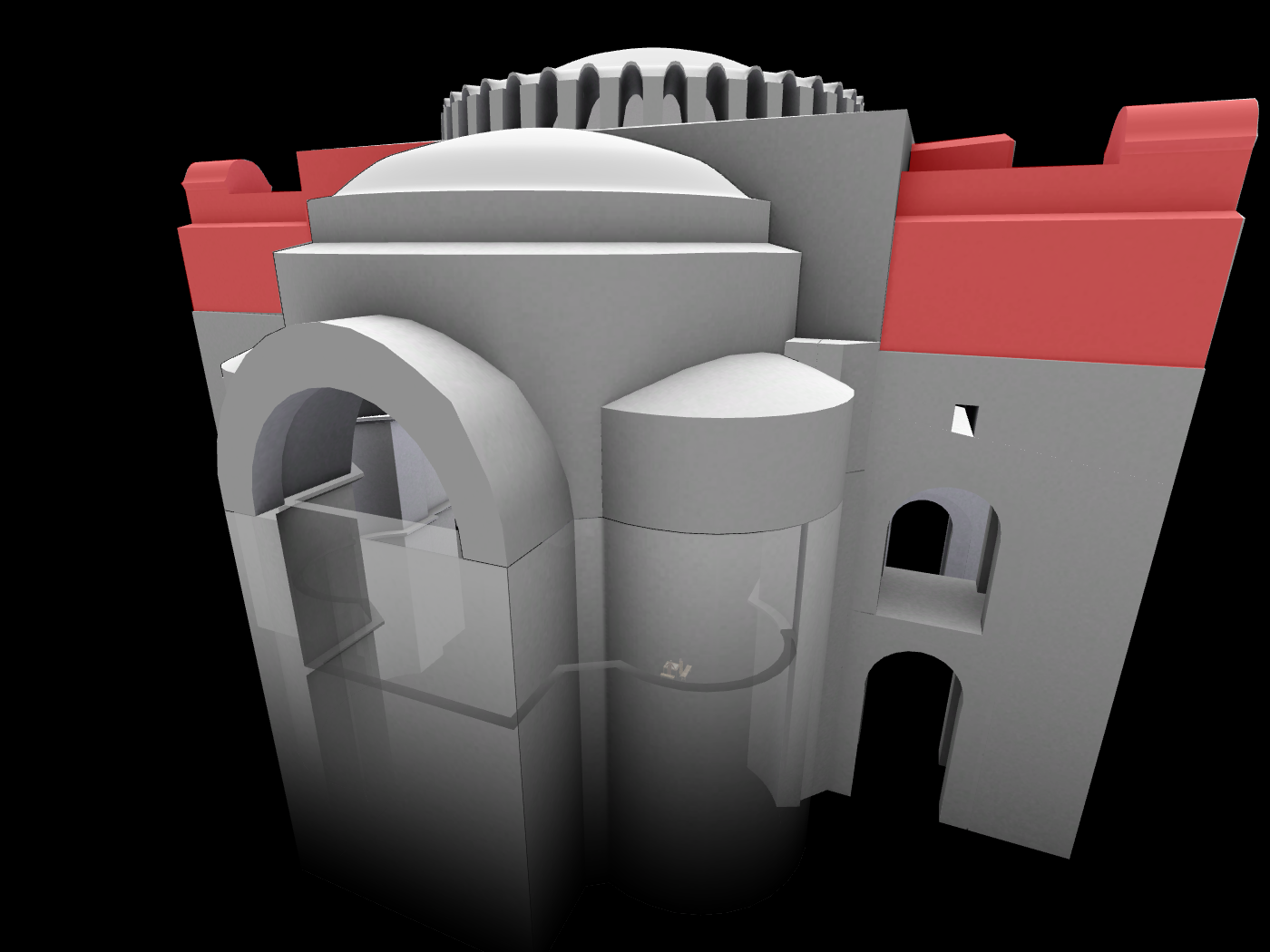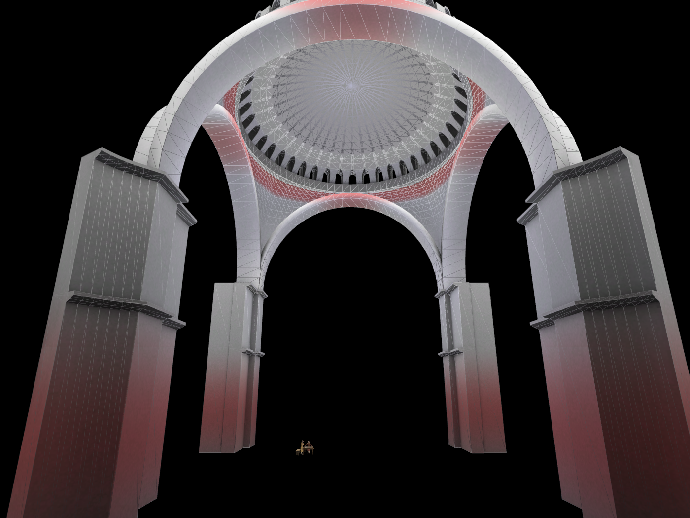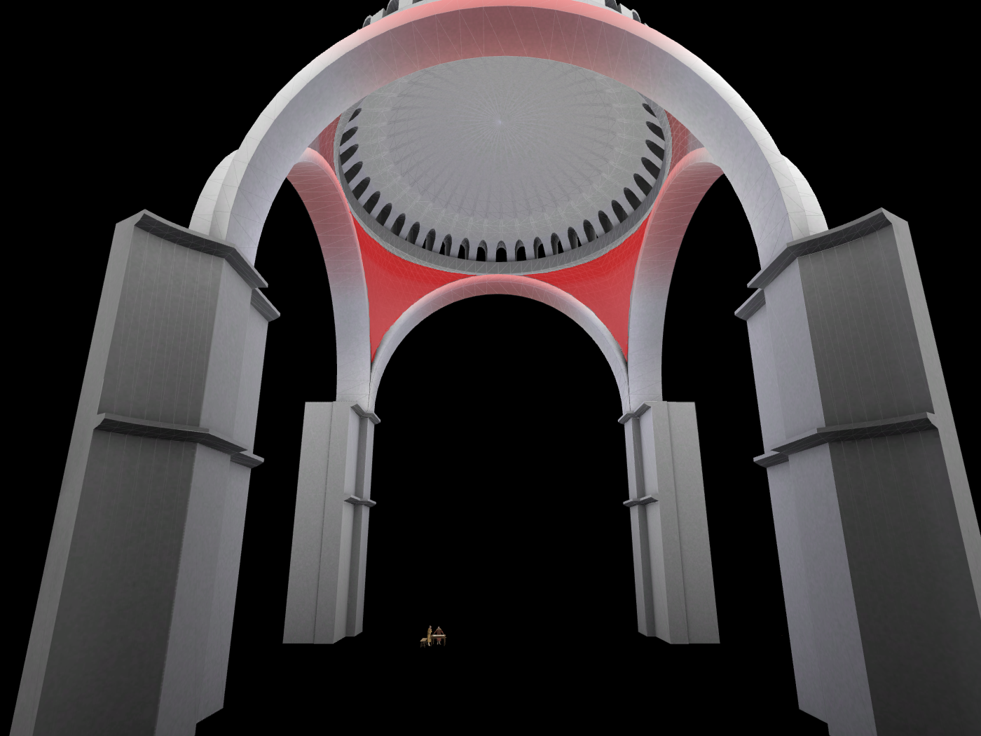 Το αποτέλεσμα ήταν η κατασκευή ενός μεγάλου τετράγωνου χώρου, ο οποίος συμβολίζει την Γή, καλυμμένου με έναν τεράστιο τρούλλο από τούβλα (που δεν καίγονται) και η προσθήκη στην κεντρικό αυτόν χώρο δύο ακόμα σε ανατολή και δύση που καλύφθηκαν με τεταρτοσφαίρια για την δημιουργία επιμήκους χώρου. Για την μορφή αυτή χρησιμοποιήθηκε ένα σύστημα δομής για τη μετάβαση από τον τρούλλο στον κύβο μέσω σφαιρικών τριγώνων (εικόνες 11 και 12).