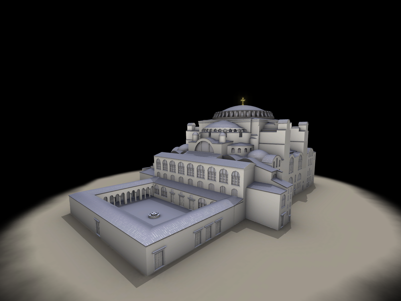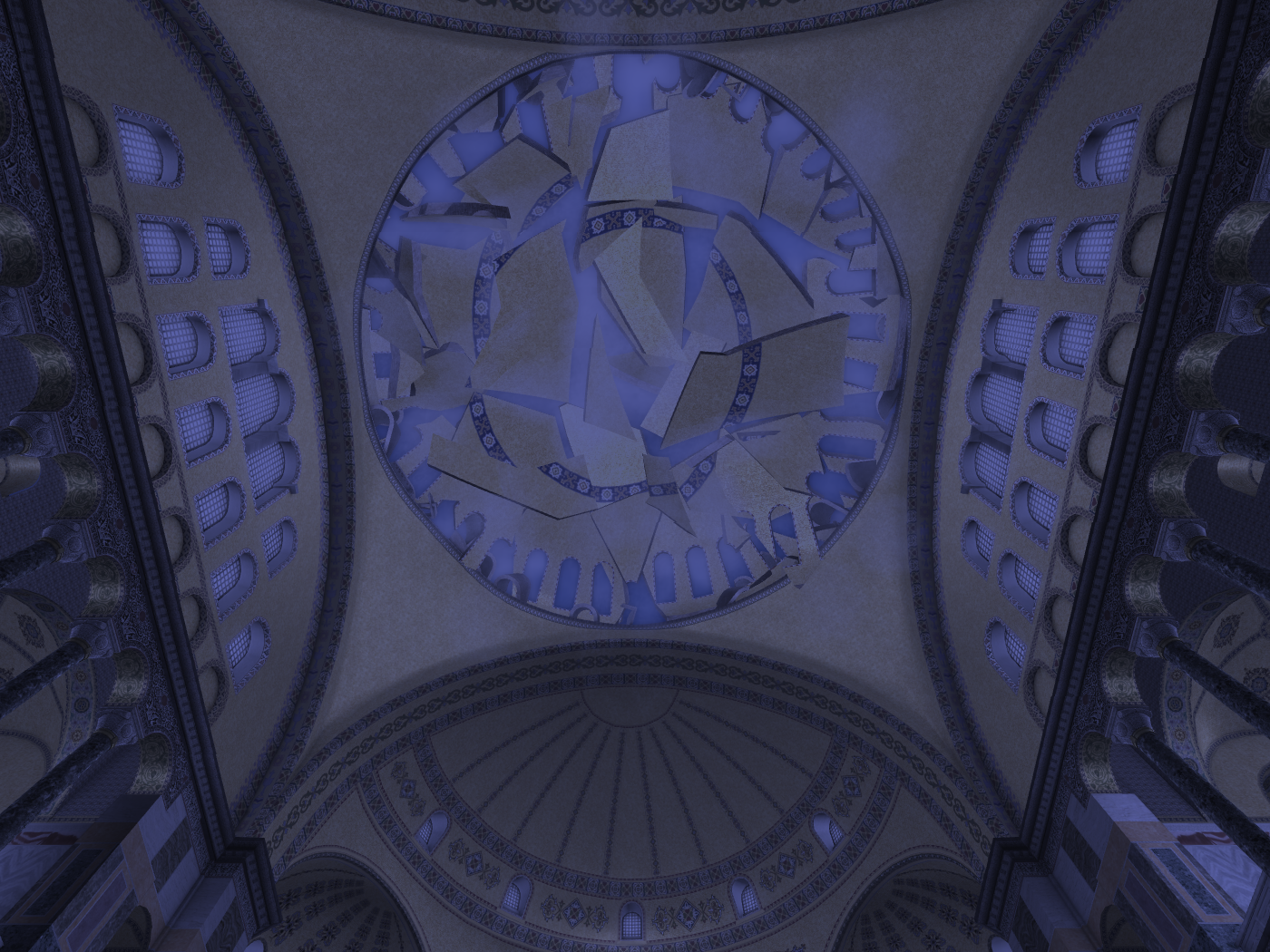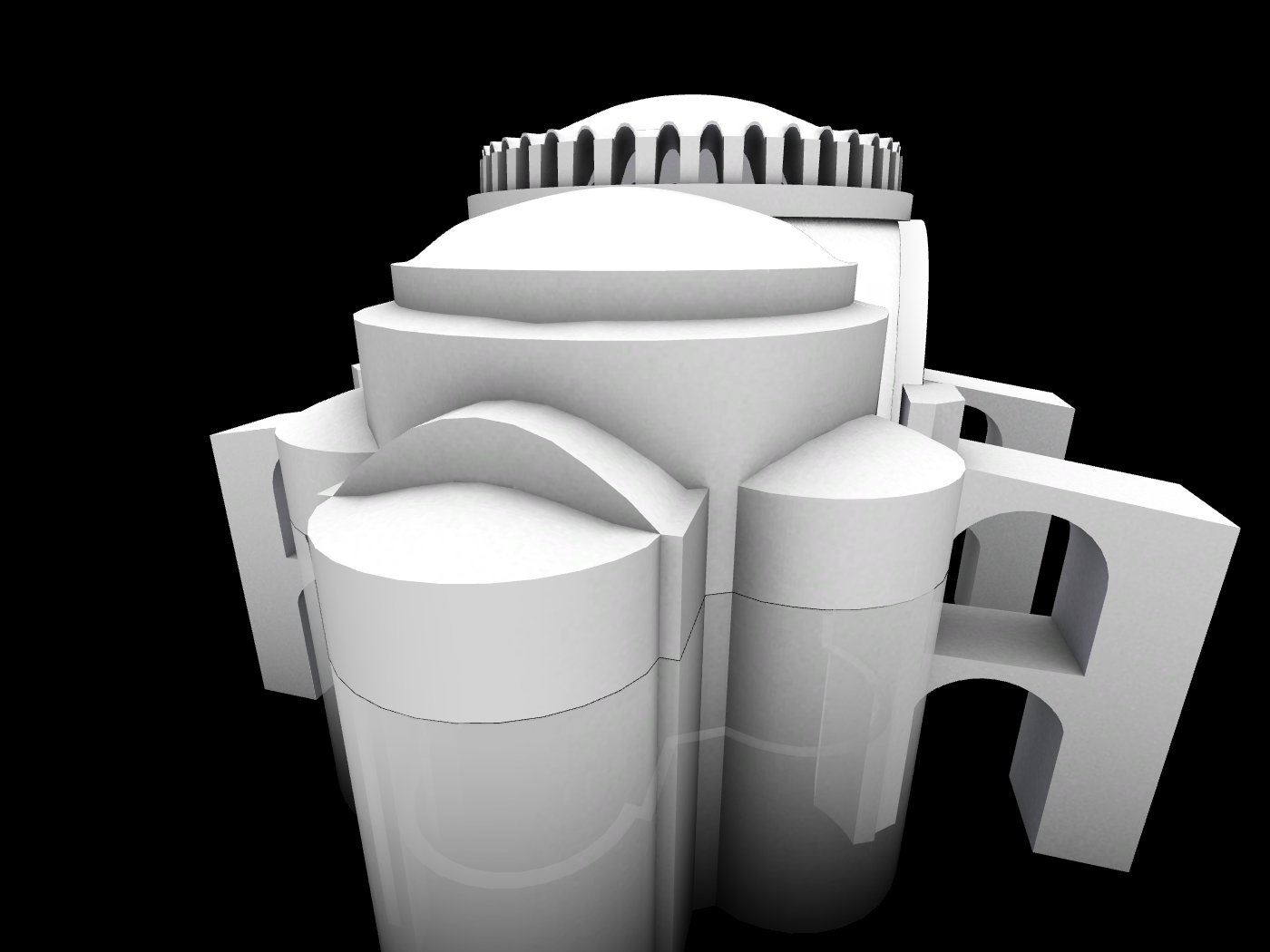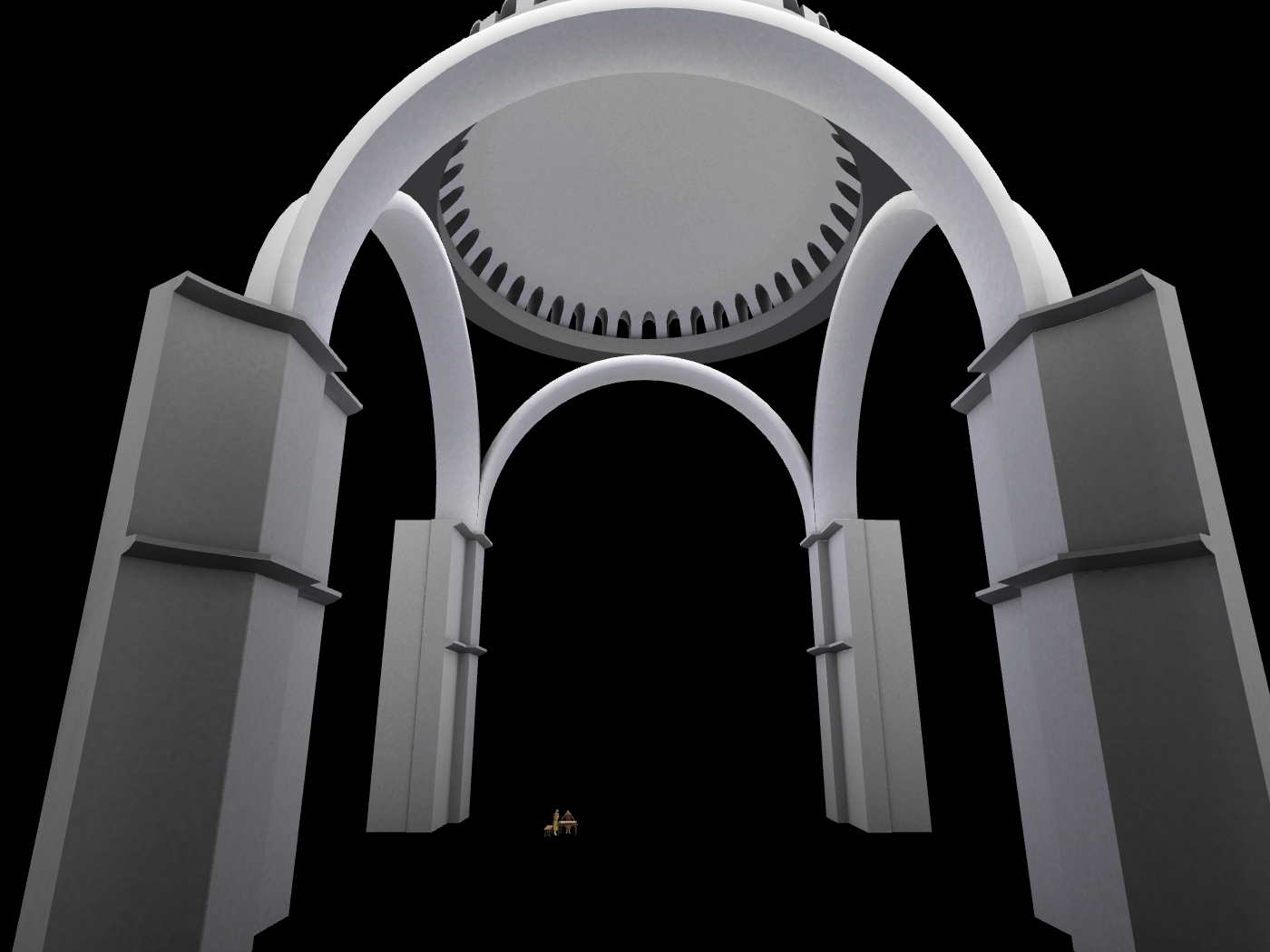 Το αποτέλεσμα ήταν η κατασκευή ενός μεγάλου τετράγωνου χώρου, ο οποίος συμβολίζει την Γή, καλυμμένου με έναν τεράστιο τρούλλο από τούβλα (που δεν καίγονται) και η προσθήκη στην κεντρικό αυτόν χώρο δύο ακόμα σε ανατολή και δύση που καλύφθηκαν με τεταρτοσφαίρια για την δημιουργία επιμήκους χώρου. Για την μορφή αυτή χρησιμοποιήθηκε ένα σύστημα δομής για τη μετάβαση από τον τρούλλο στον κύβο μέσω σφαιρικών τριγώνων (εικόνες 11 και 12).