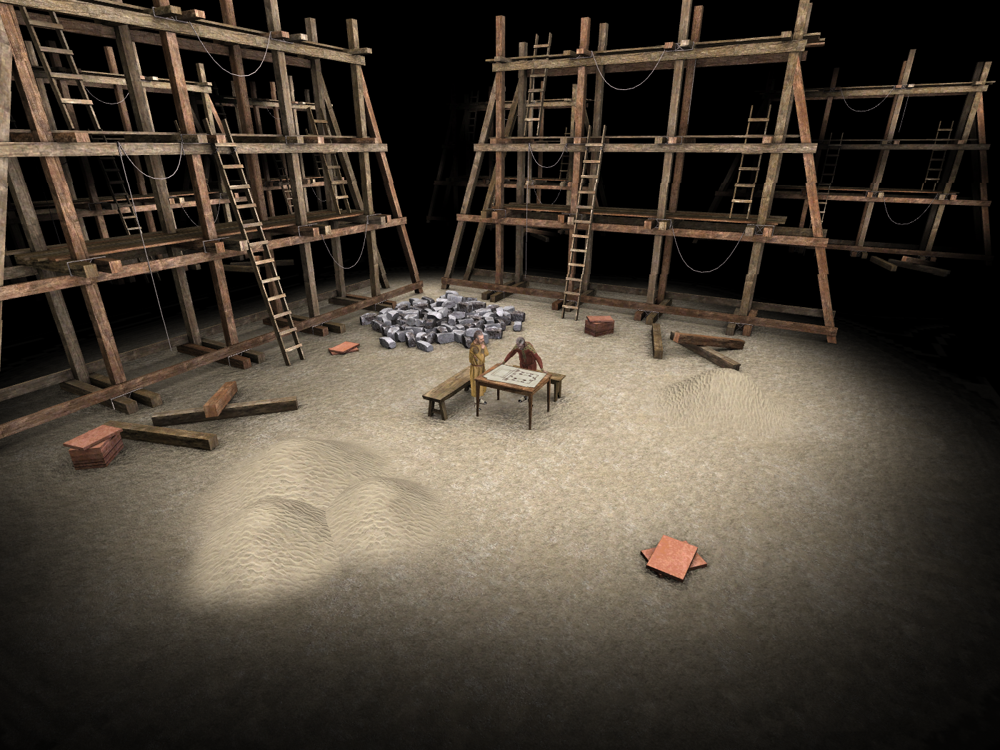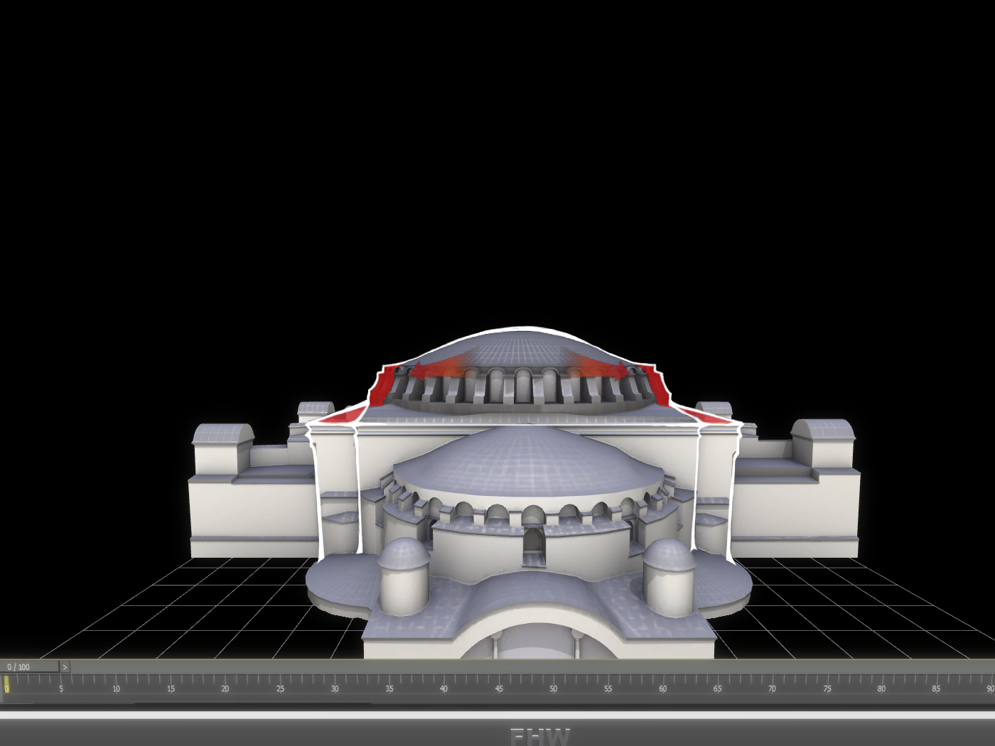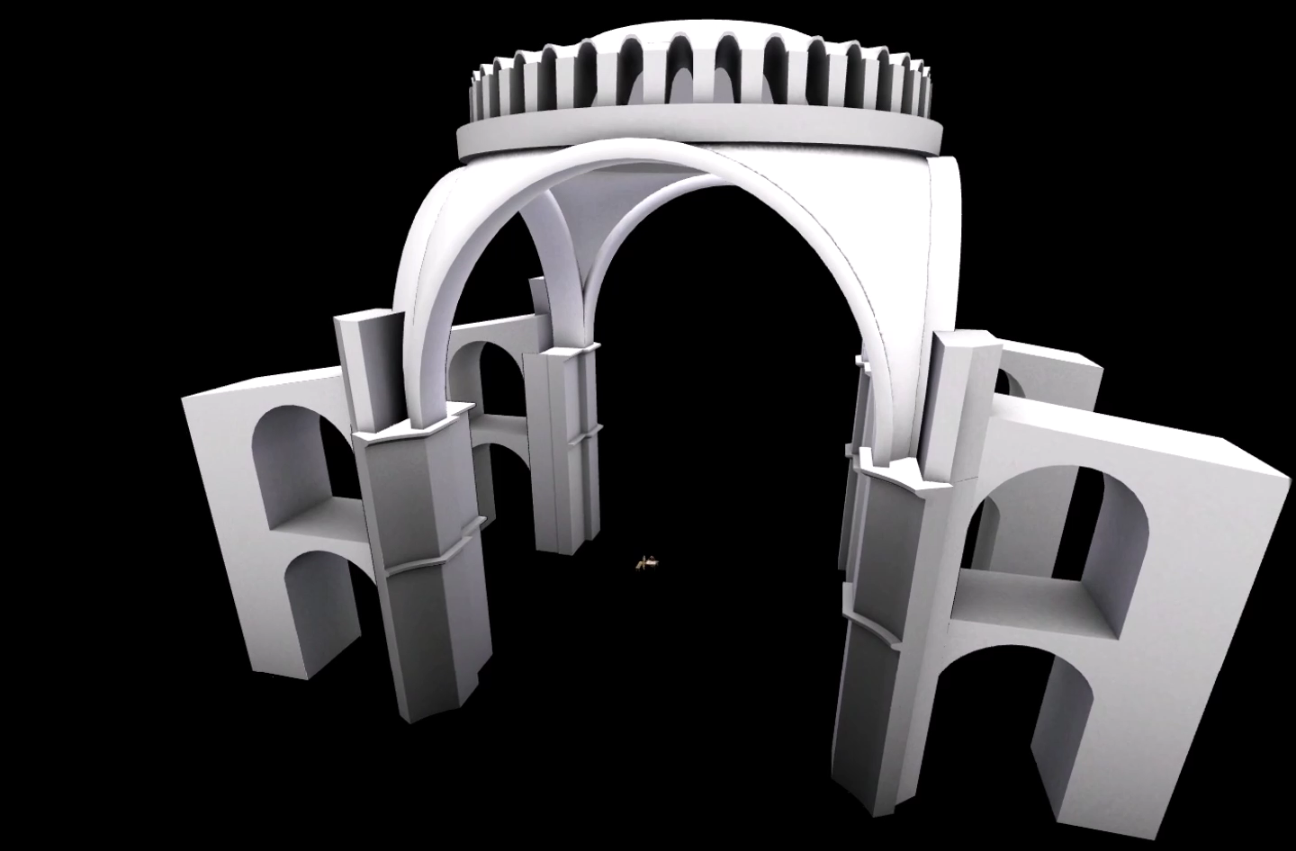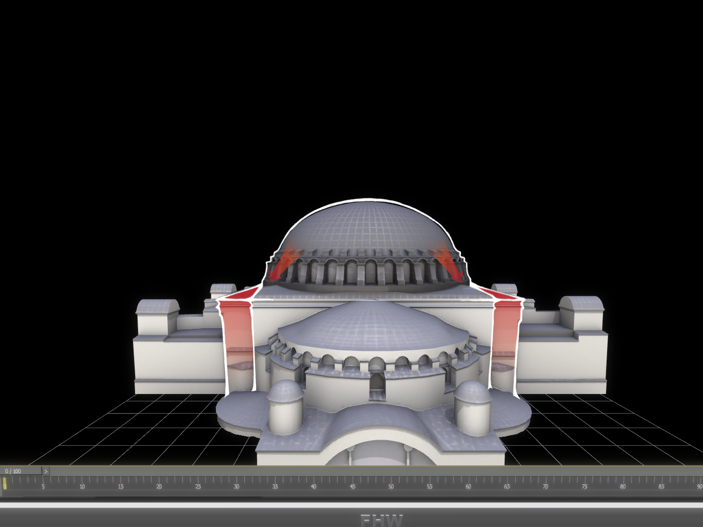Το αποτέλεσμα ήταν η κατασκευή ενός μεγάλου τετράγωνου χώρου, ο οποίος συμβολίζει την Γή, καλυμμένου με έναν τεράστιο τρούλλο από τούβλα (που δεν καίγονται) και η προσθήκη στην κεντρικό αυτόν χώρο δύο ακόμα σε ανατολή και δύση που καλύφθηκαν με τεταρτοσφαίρια για την δημιουργία επιμήκους χώρου. Για την μορφή αυτή χρησιμοποιήθηκε ένα σύστημα δομής για τη μετάβαση από τον τρούλλο στον κύβο μέσω σφαιρικών τριγώνων (εικόνες 11 και 12).