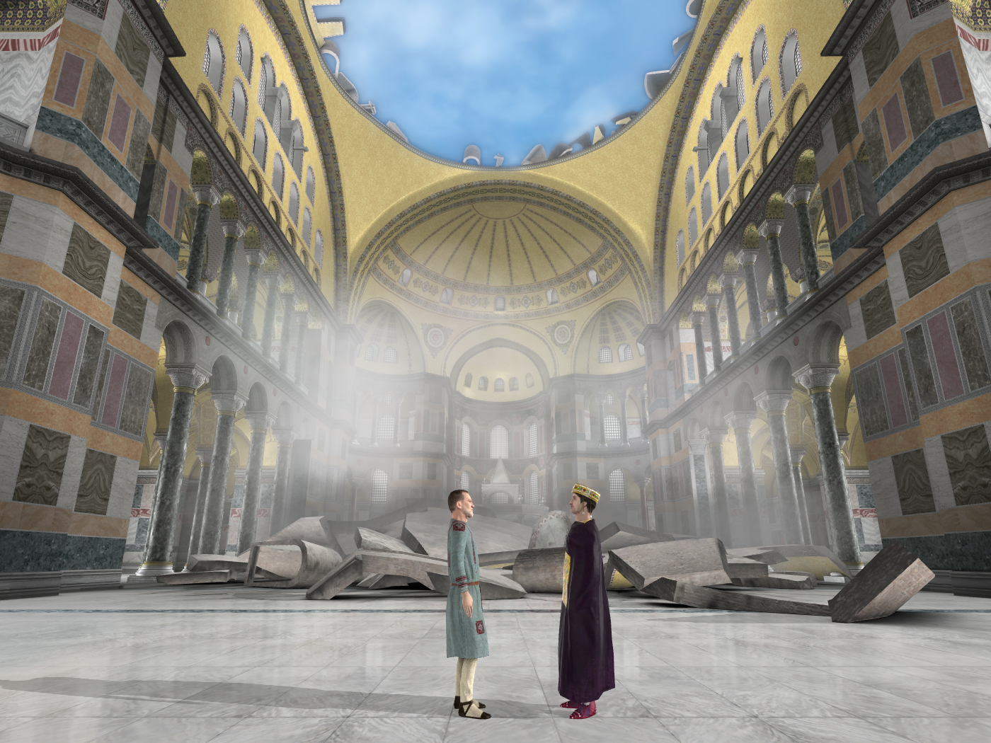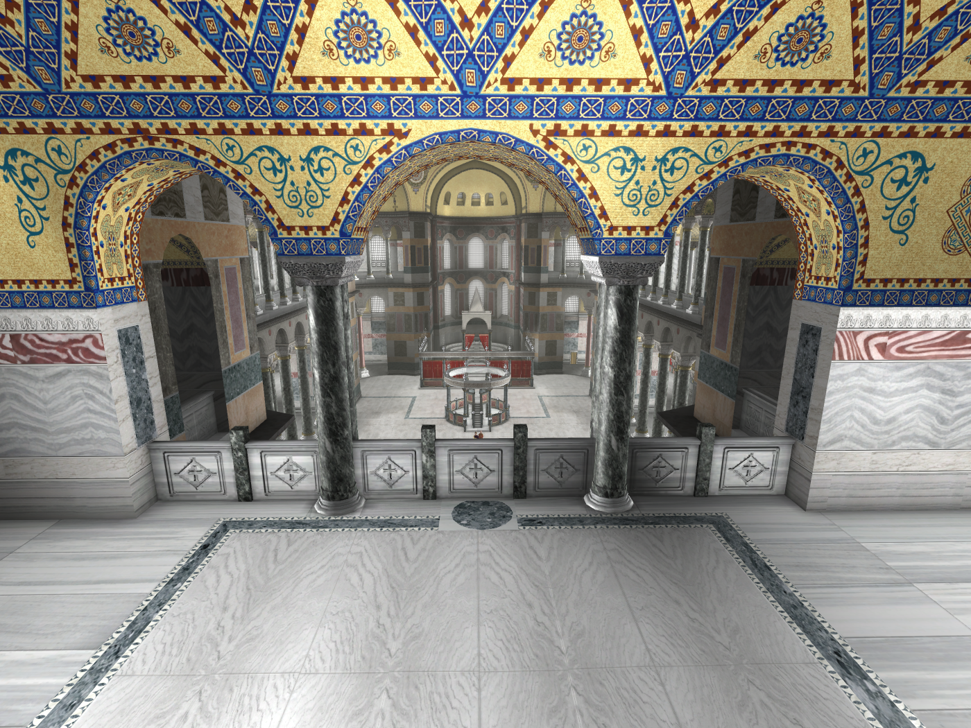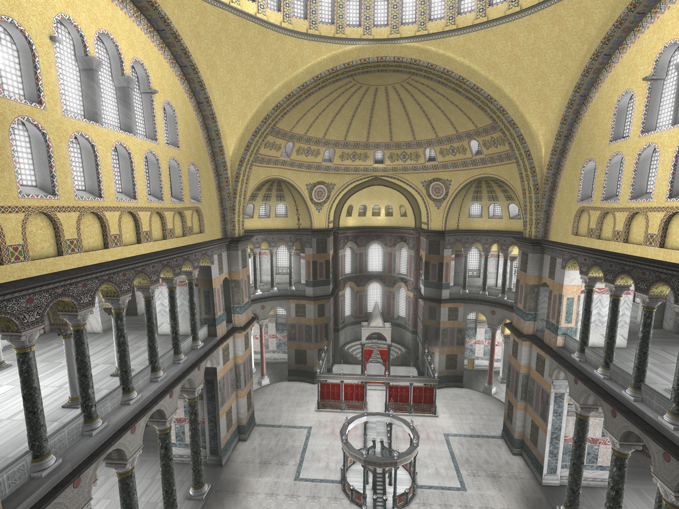 Καταλαμβάνουν τον όροφο πάνω από τα κλίτη και τον εσωνάρθηκα ήταν προσβάσιμα μέσω σπειροειδών κεκλιμένων επιπέδων στις τέσσερις γωνίες του ναού. Σήμερα μόνο η βορειοδυτική γωνία χρησιμοποιείται για το σκοπό αυτό. Από εδώ παρακολουθούσαν τη Θεία Λειτουργία οι ευγενείς και η αυτοκράτειρα. Πιθανόν το ομφάλιο στο κέντρο του δυτικού υπερώου συμβολίζει τη θέση της (εικόνα 25α).