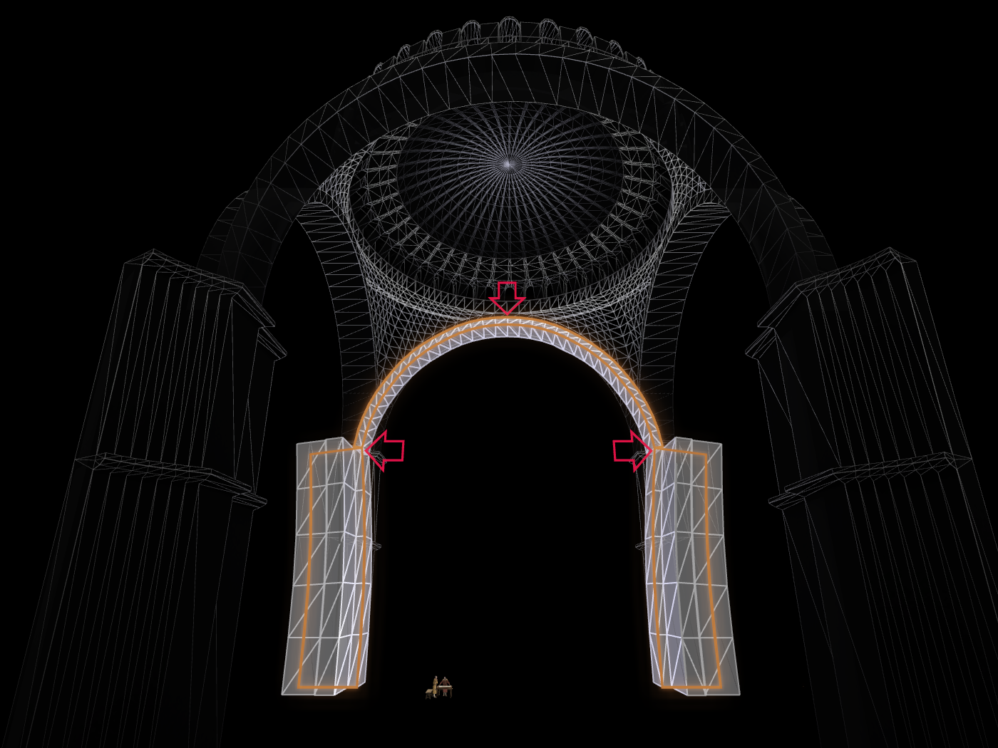 Η στήριξη ενός τρούλλου σε τετράγωνο χώρο απαίτησε πρωτοποριακό σχεδιασμό με την χρήση τεσσάρων σφαιρικών τριγώνων, μέθοδος που δεν είχε ξαναχρησιμοποιηθεί ποτέ στην ιστορία της αρχιτεκτονικής. Τα παλαιότερα συστήματα (ημιχώνια, σύστημα επεξοχής) ήταν ατελεστέρα και οπωσδήποτε κάλυπταν πολύ μικρότερους χώρους. Τα σφαιρικά τρίγωνα, στα οποία στηρίζεται ο τρούλλος μεταβιβάζουν τα τεράστια φορτία της κυκλικής βάσης του τρούλλου σε τέσσερα στηρίγματα (εικόνα 18).