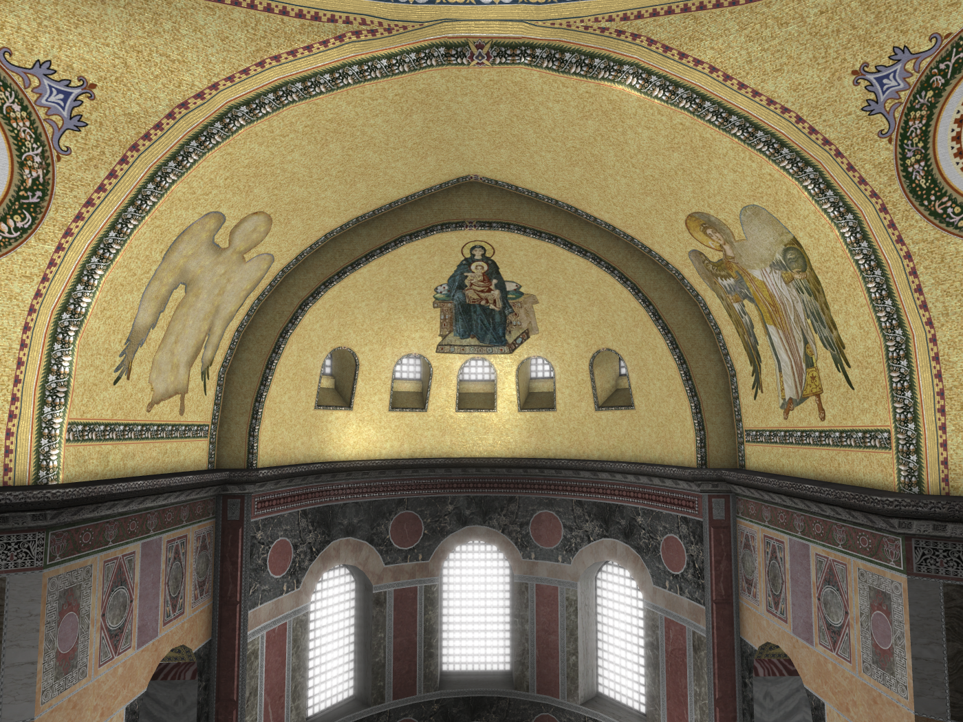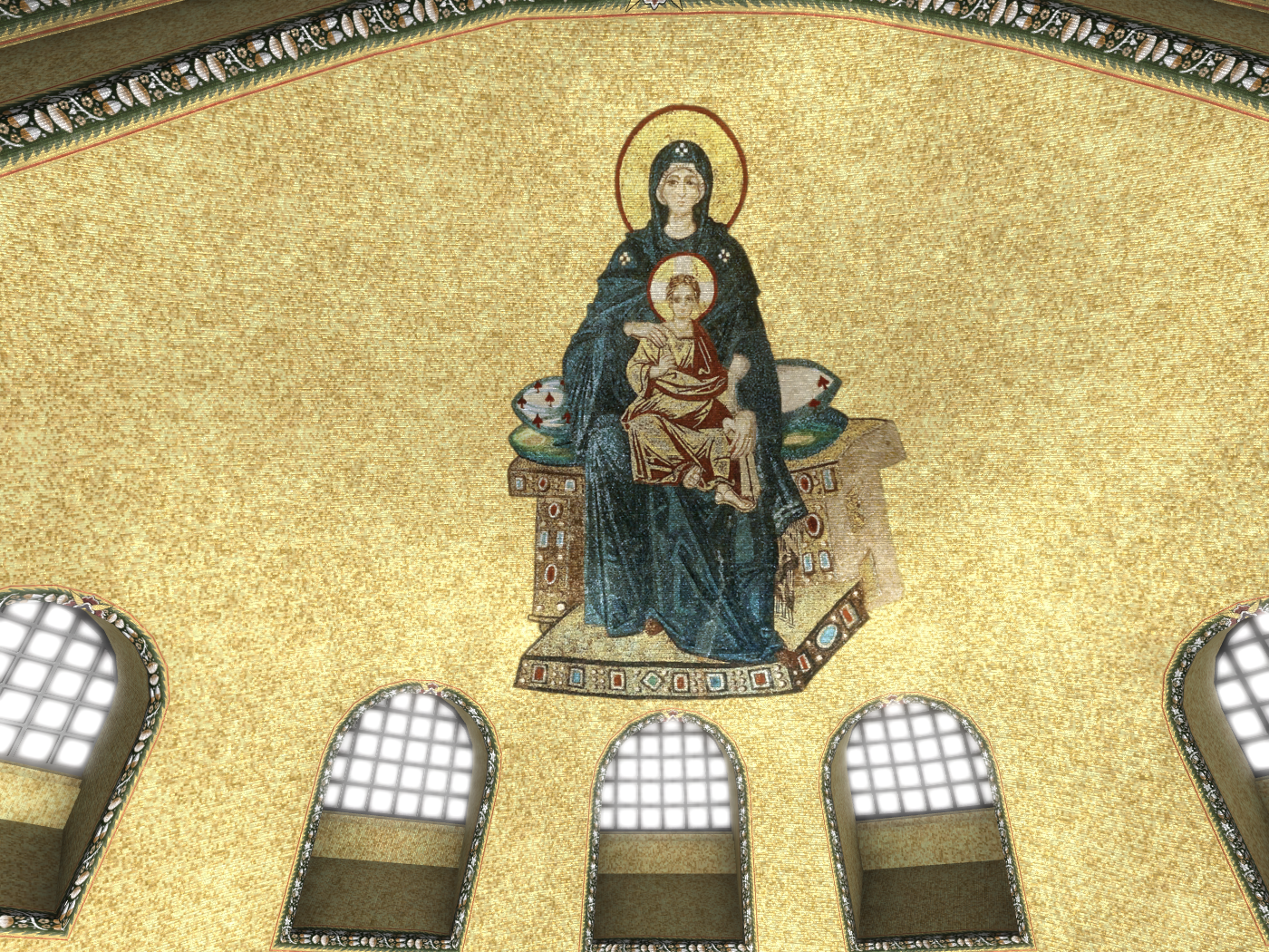 Η Θεοτόκος στην αψίδα. Η Θεοτόκος παριστάνεται καθιστή σε θρόνο με τον μικρό Ιησού στην αγκαλιά της. Η υπόλοιπη αψίδα καλύπτεται με χρυσές ψηφίδες. Περιμετρικά υπάρχει φυτικός διάκοσμος (εικόνα 43). Η σύνθεση συμπληρώνεται με δύο σεβίζοντες αγγέλους (εικόνα 44) που βρίσκονται στο κάτω μέρος της καμάρας του ιερού (ο ένας από αυτούς πολύ κατεστραμμένος). Σώζεται τμήμα της κτητορικής επιγραφής που αναφέρει δύο αυτοκράτορες. Για την χρονολόγηση υπάρχουν πολλές απόψεις. Η εικόνα της Θεοτόκου, κατά μια εκδοχή, είναι αυτή που ο Πατριάρχης Φώτιος αναφέρει σε ομιλία του 867μΧ, ότι είχε μόλις πριν από λίγο κατασκευαστεί. Ωστόσο υπάρχουν αμφιβολίες για το τελευταίο, γιατί ο Φώτιος μιλάει για ζωγραφική. Άλλοι μελετητές υποστήριξαν ότι το ψηφιδωτό κατασκευάστηκε κατά το εικονόφιλο μεσοδιάστημα 787-815, κατόπιν καλύφθηκε από τους εικονομάχους, ξεχάστηκε, επιζωγραφίστηκε και με τους φοβερούς σεισμούς του 1343 κα 1348 αποκαλύφθηκε και συντηρήθηκε. Το ψηφιδωτό παρέμεινε σε θέα έως τουλάχιστον το 1750, καλύφθηκε και αποκαλύφθηκε ξανά στις εργασίες της δεκαετίας του 1930. Ο φυτικός διάκοσμος ανήκει στην αρχική Ιουστινιάνεια διακόσμηση.