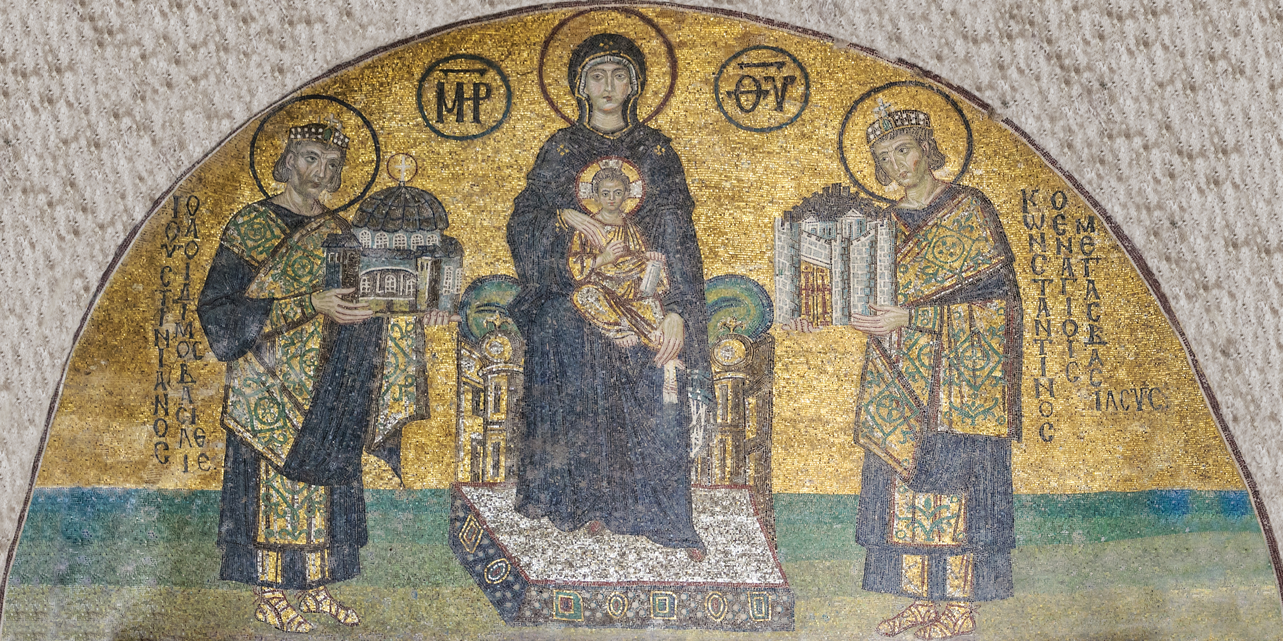 Οι αυτοκράτορες στην νοτιοδυτική πρόσβαση (εικόνα 47). Η Θεοτόκος παρουσιάζεται ένθρονη με τον μικρό Ιησού στην αγκαλιά της σε χρυσό φόντο. Εκατέρωθεν της στέκονται ο Κωνσταντίνος, ο οποίος προσφέρει την Κωνσταντινούπολη και ο Ιουστινιανός, ο οποίος προσφέρει ομοίωμα της Αγίας Σοφίας. Επιγραφές καθορίζουν ποια είναι ακριβώς τα πρόσωπα αυτά. Το μωσαϊκό φωτίζεται επαρκώς από φεγγίτη ακριβώς απέναντι. Η χρονολόγηση του είναι αμφίβολη με τους μελετητές να συγκλίνουν σε μια χρονολογία στα τέλη του 10ου αιώνα αρχές του 11ου.
