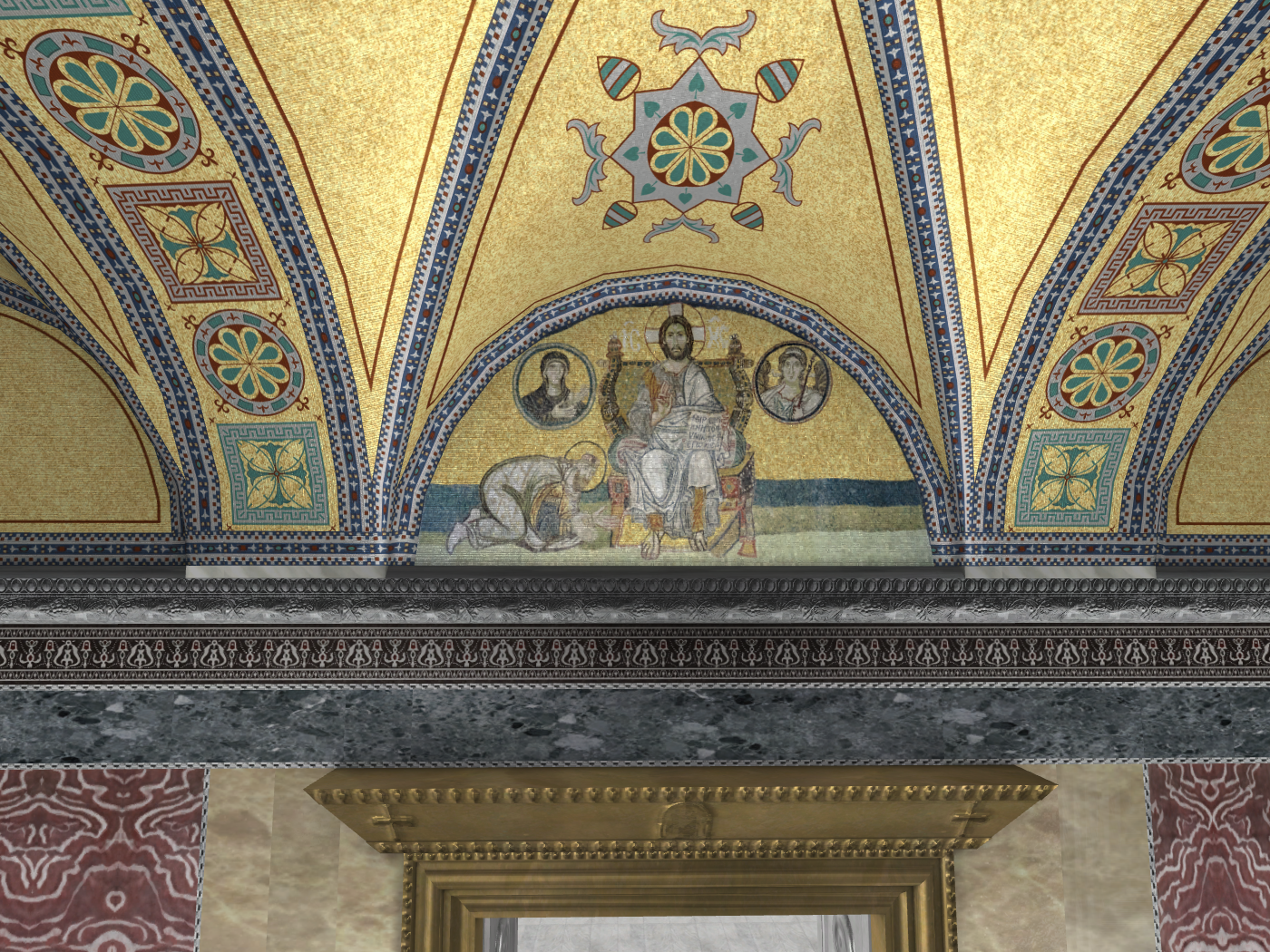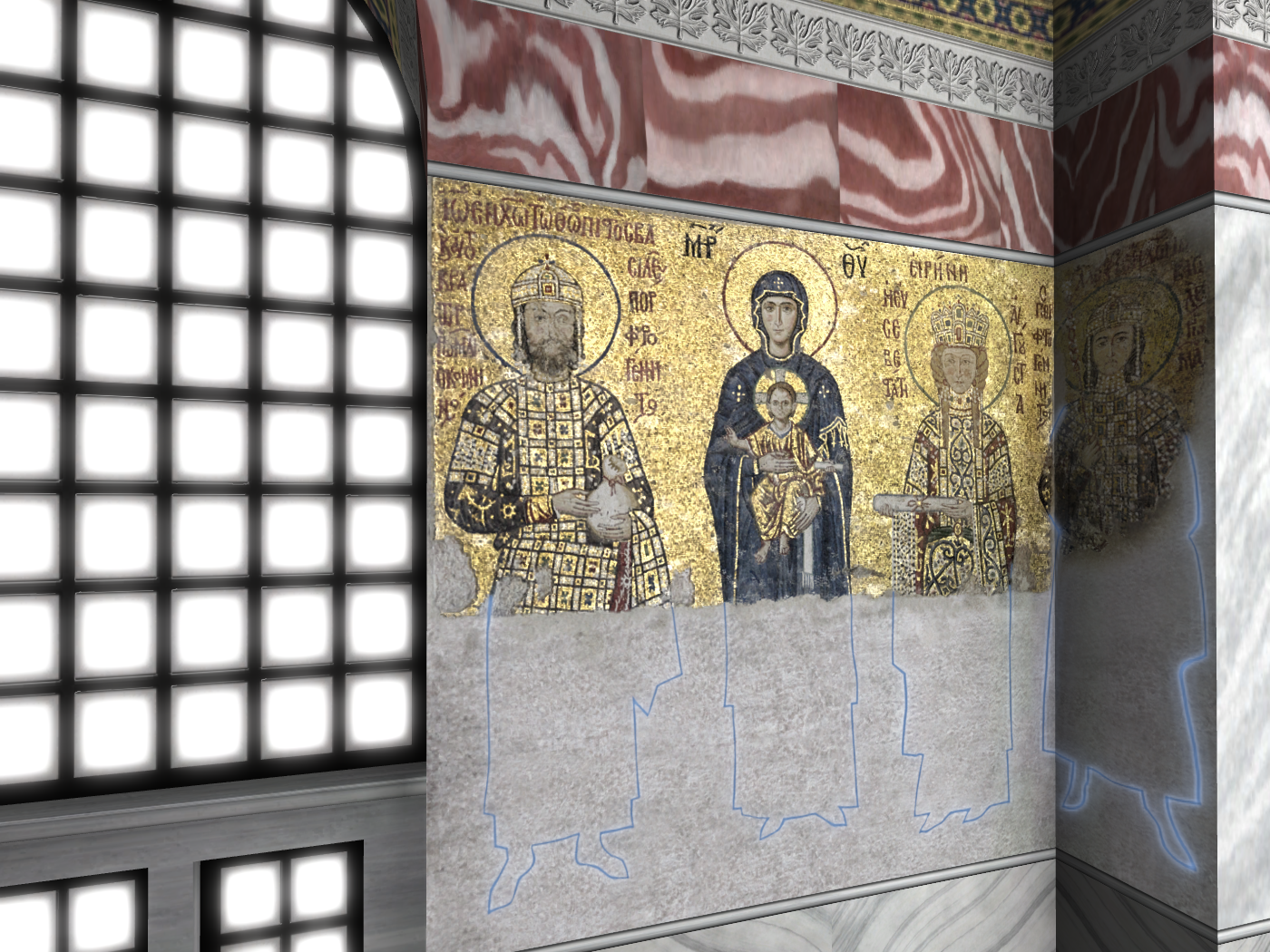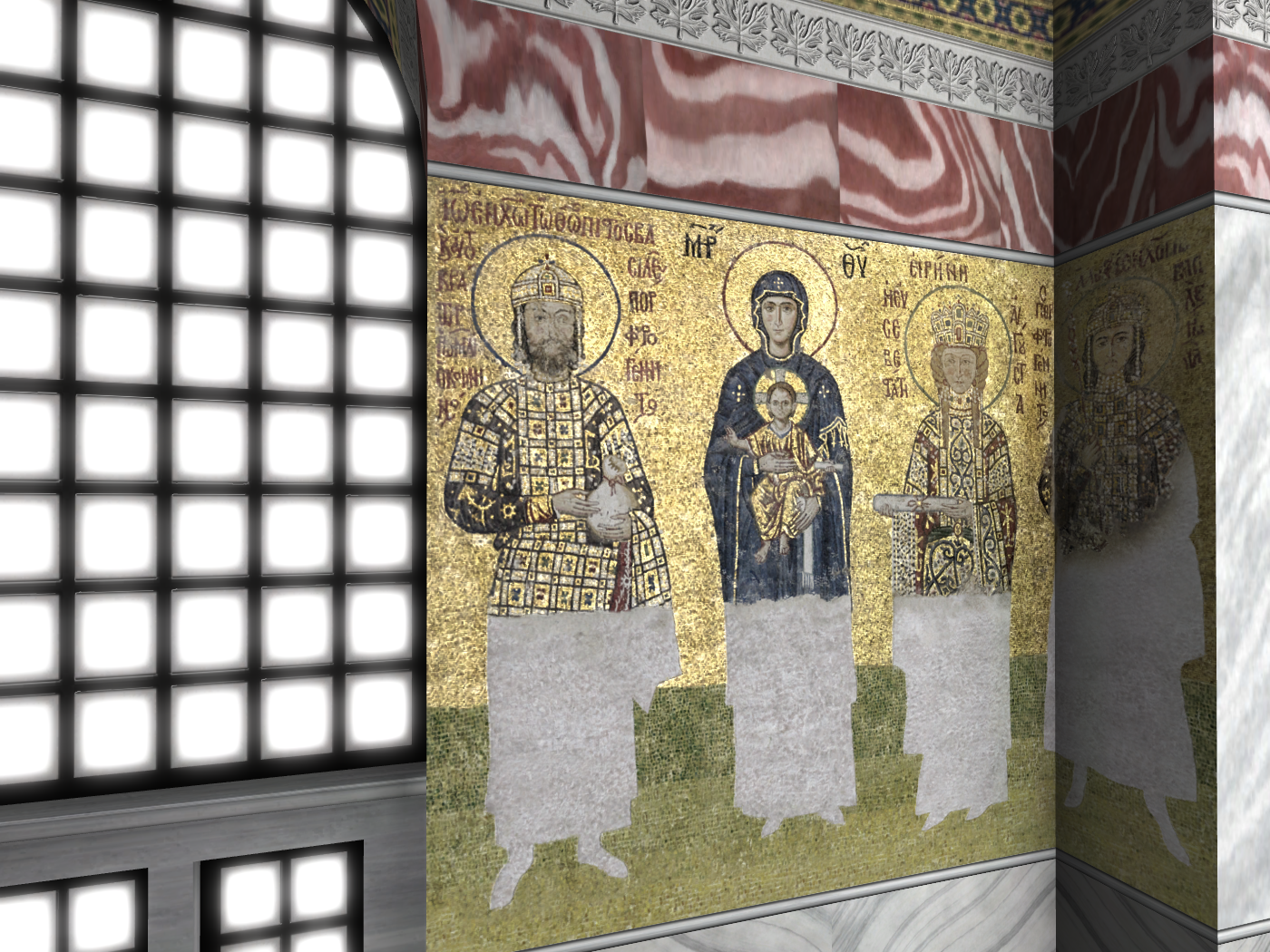 Κομνηνοί στον νότιο υπερώο (δεξιά του παραθύρου). (εικόνα 55, 56 και 57) Παρουσιάζεται η Παναγία ένθρονη με τον Χριστό αγκαλιά, αριστερά ο αυτοκράτωρ Ιωάννης Κομνηνός, που κρατεί αποκόμπιον και δεξιά η σύζυγος του Ειρήνη (κόρη του Λαδισλάς της Ουγγαρίας). Στον νότιο τοίχο εμφανίζεται ο Αλέξιος γιος των δυο. Διαφορές ανάμεσα στα πορτραίτα δεν υπάρχουν. Πιθανότατα κατασκευάστηκαν συγχρόνως ή σχεδόν συγχρόνως κατά την ανάρρηση του Αλέξιου ως συναυτοκράτορα στο θρόνο το 1122.