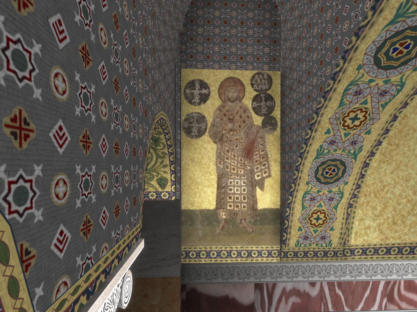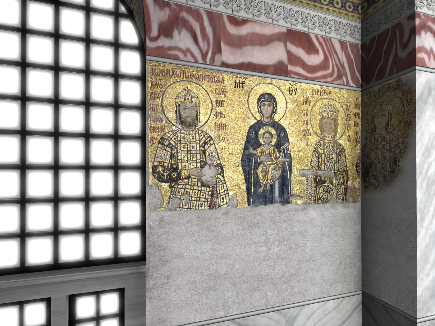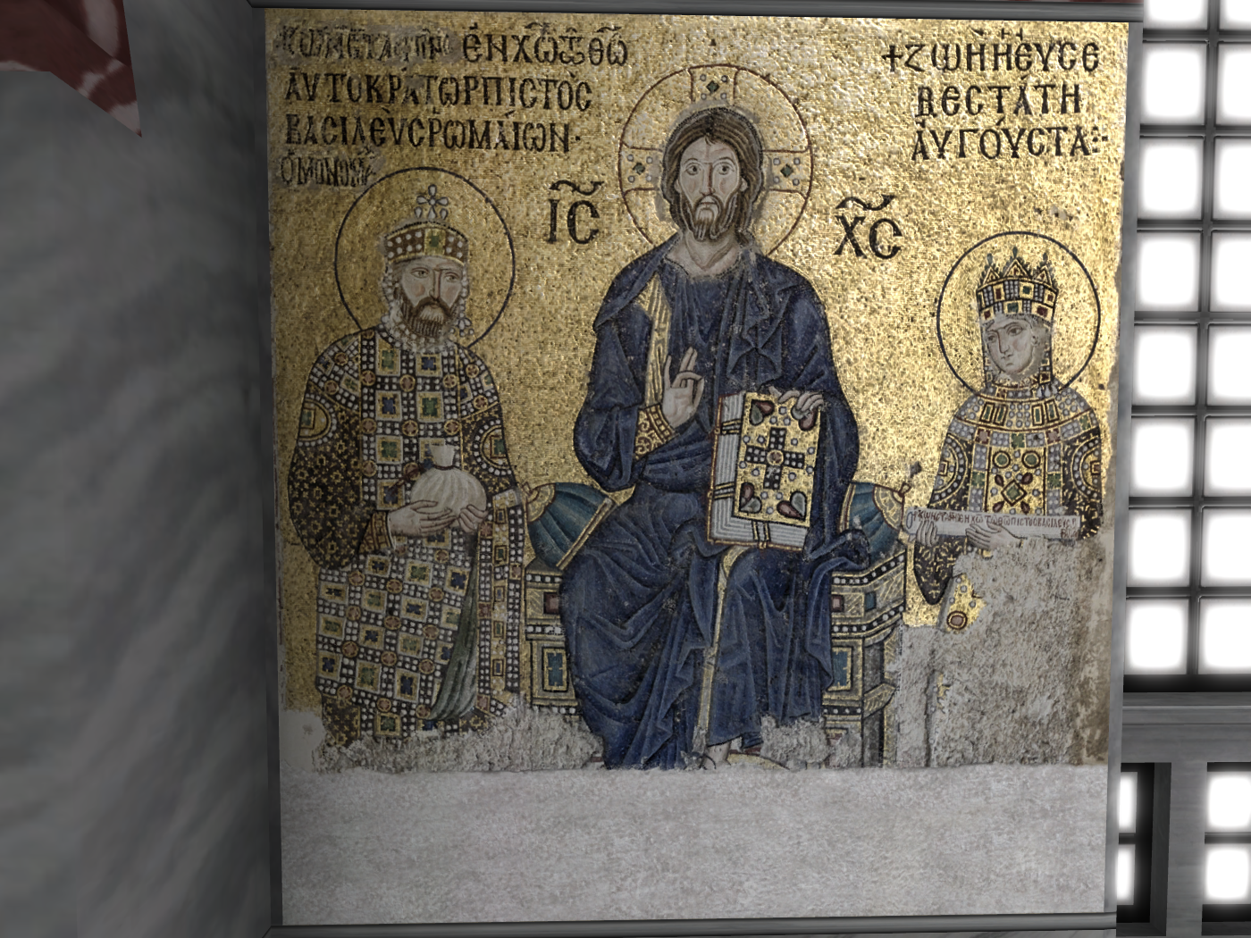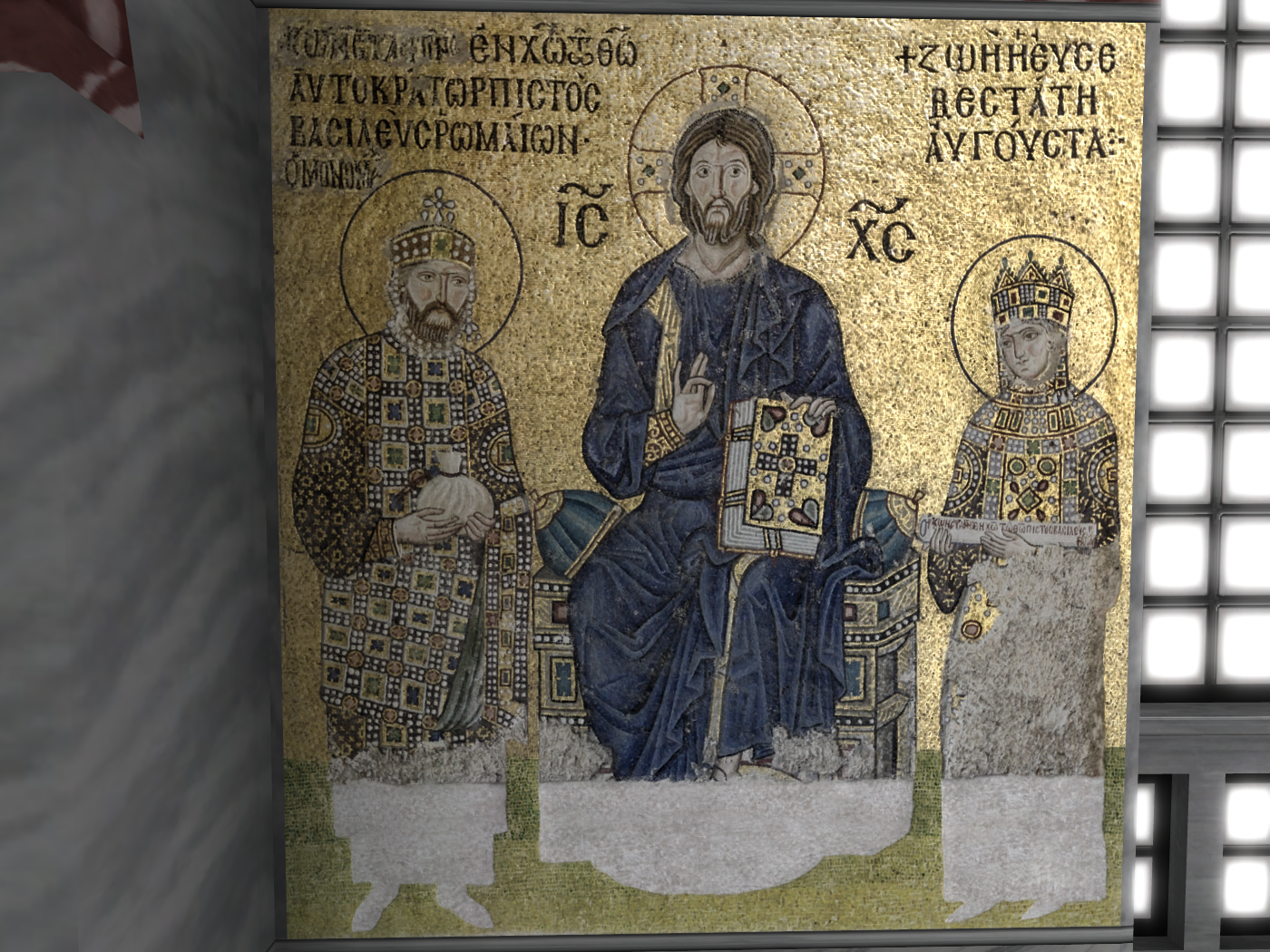 Κωνσταντίνος και Ζωή στο νότιο υπερώο (αριστερά του παραθύρου) (εικόνες 52, 53 και 54). Παρουσιάζεται ο Χριστός στη μέση ένθρονος δεξιά η αυτοκράτειρα Ζωή και αριστερά ο Κωνσταντίνος IX Μονομάχος που προσφέρει το αποκόμπιον (χρήματα). Και τα τρία κεφάλια έχουν προφανώς αντικατασταθεί. Η Ζωή παντρεύτηκε τρεις άνδρες τον Ρωμανό Αργυρό (1028-134), τον Μιχαήλ IV τον Παφλαγόνα (1034-1041) και τον Κωνσταντίνο IX (1042-155) και παρουσιάζεται εδώ σε νεαρή ηλικία. Το ψηφιδωτό πιθανότατα χρονολογείται την εποχή του Ρωμανού Αργυρού το κεφάλι του οποίου αντικαταστάθηκε με το σημερινό.