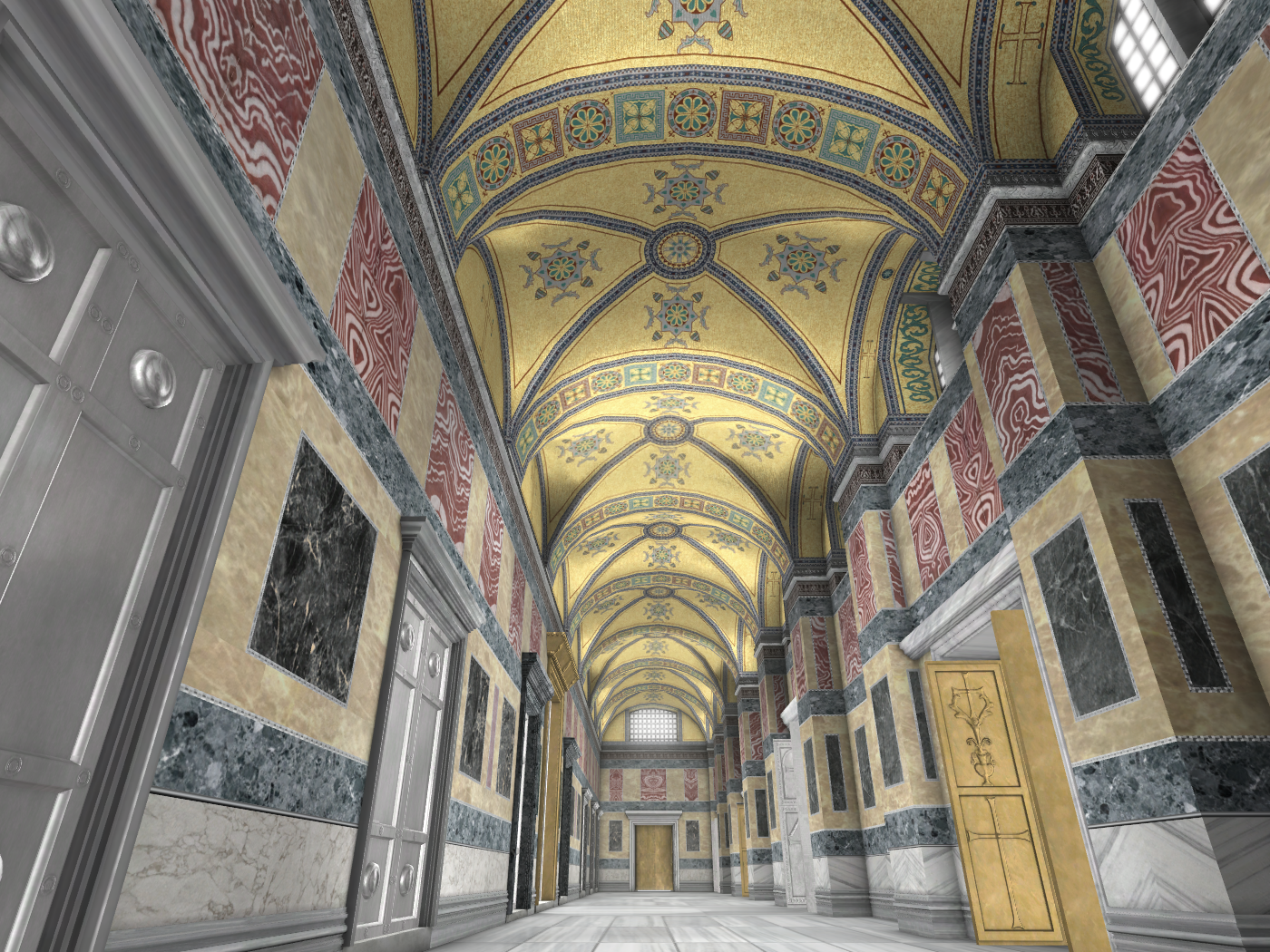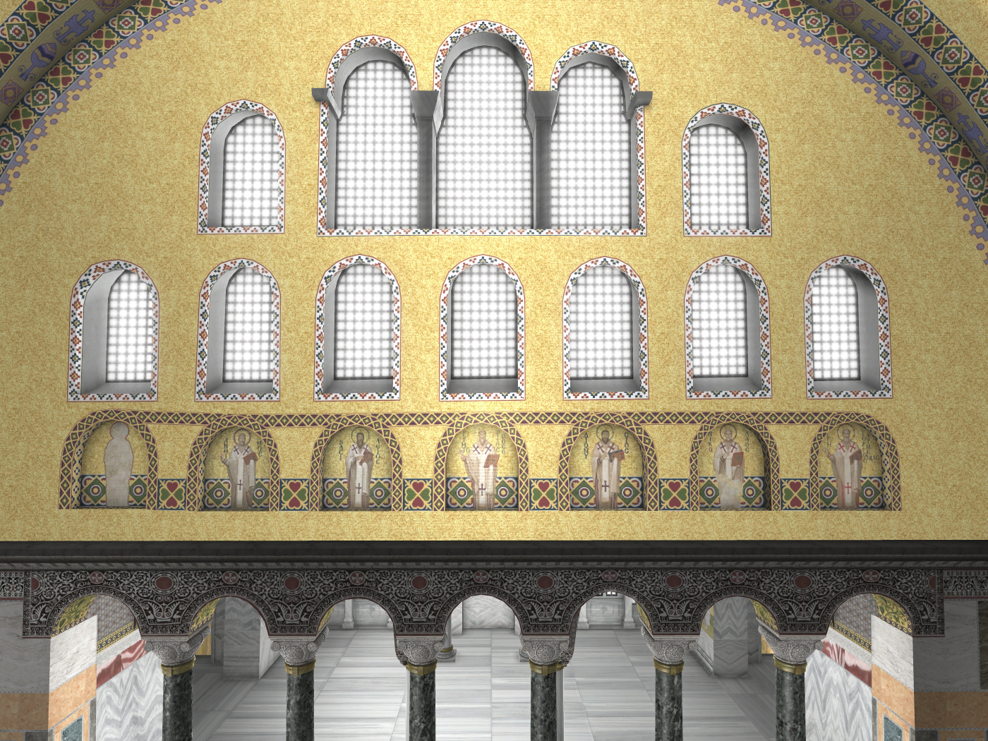 Ανεικονικός διάκοσμος στον νάρθηκα. Διασώζεται σε ιδιαίτερα μεγάλο βαθμό πάνω από τις μαρμάρινες κορνίζες και έχει συμπληρωθεί με χρώμα τον 19ο αιώνα (Fossati). Αποτελείται κυρίως από σταυρούς και ανεικονικές συνθέσεις με άνθη. Μπορεί να χρονολογηθεί στην αρχική, Ιουστινιάνεια κατασκευή του ναού και αποτελεί ένα μοναδικό σύνολο από το οποίο μπορούμε να καταλάβουμε πως ήταν αρχικά διακοσμημένος ο ναός (οι παραστάσεις προστεθήκαν μετά τον 9ο αιώνα). Στον νάρθηκα οι ανεικονικές παραστάσεις είναι σχεδόν πλήρεις. (εικόνα 59).