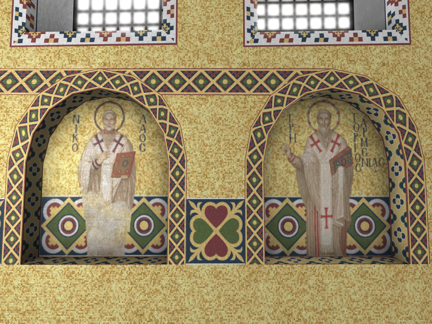 Επίσκοποι και προφήτες στα τύμπανα των τόξων. Τα τύμπανα είναι οι μοναδικές επίπεδες επιφάνειες του ναού. Σε αυτές υπήρχαν αρχικά δεκατέσσερις επίσκοποι στο κάτω μέρος, δώδεκα ελάσσονες προφήτες και τέσσερεις μείζονες στις άκρες και πιθανόν άγγελοι στο άνω μέρος, συνολικά δεκαοκτώ πρόσωπα σε κάθε τύμπανο (εικόνες 50 και 51). Όλες οι μορφές κατασκευάστηκαν την ίδια περίοδο πιθανόν κατά την βασιλεία του Βασίλειου I δηλαδή τον 9ο αιώνα.