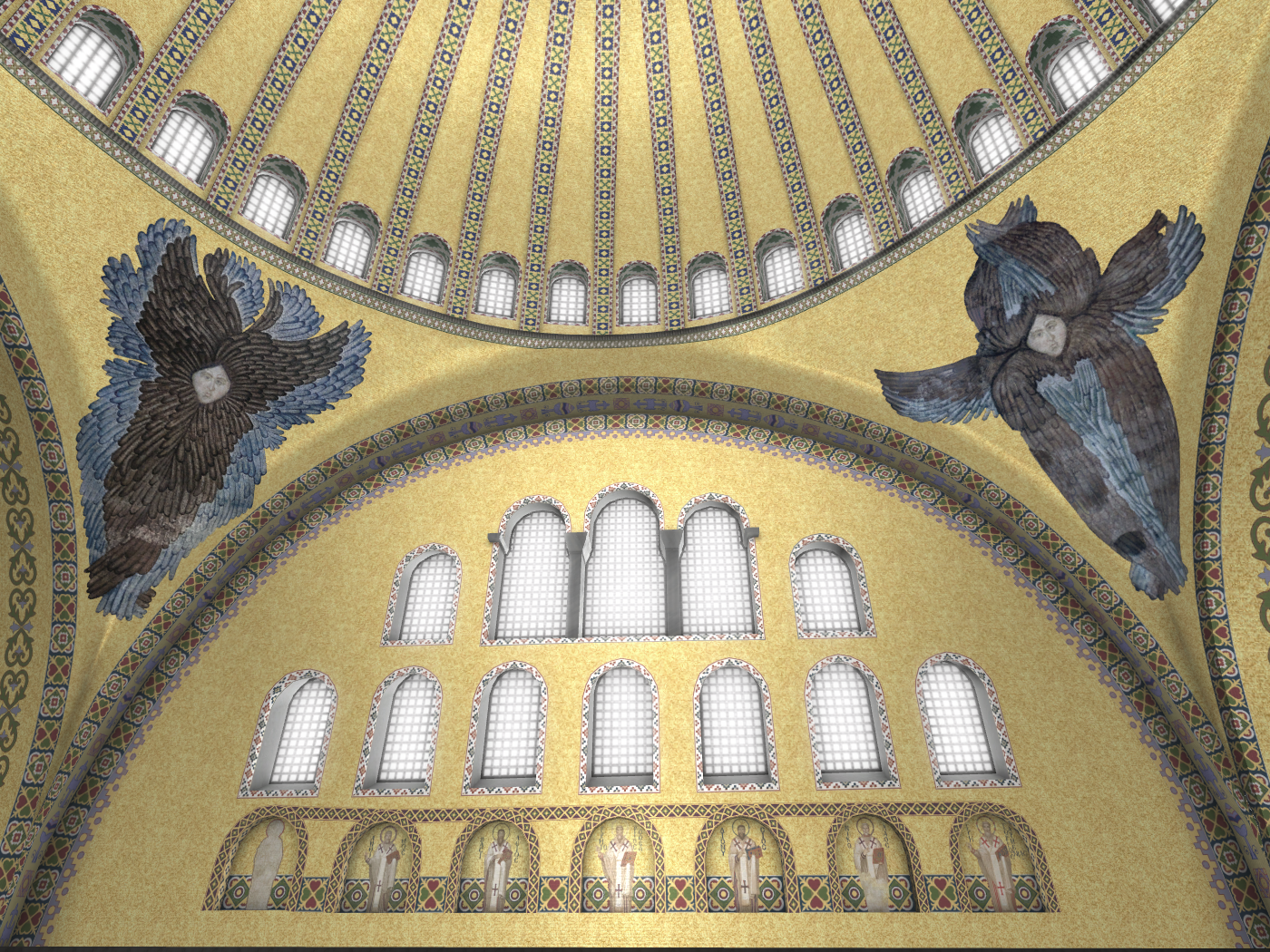Εξαπτέρυγα σεραφείμ στα σφαιρικά τρίγωνα. (εικόνα 58) Μόνο τα δύο ανατολικά είναι ψηφιδωτά, τα άλλα δυο ζωγραφιστήκαν κατ’ αναλογίαν στις επισκευές του 1848 από τους αδερφούς Fossati. Τα σεραφείμ ήταν ορατά έως τον 18ο αιώνα και καταγραφτήκαν από τους περιηγητές.