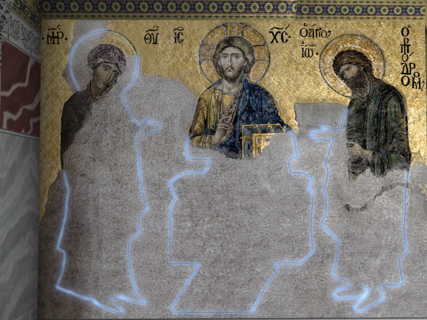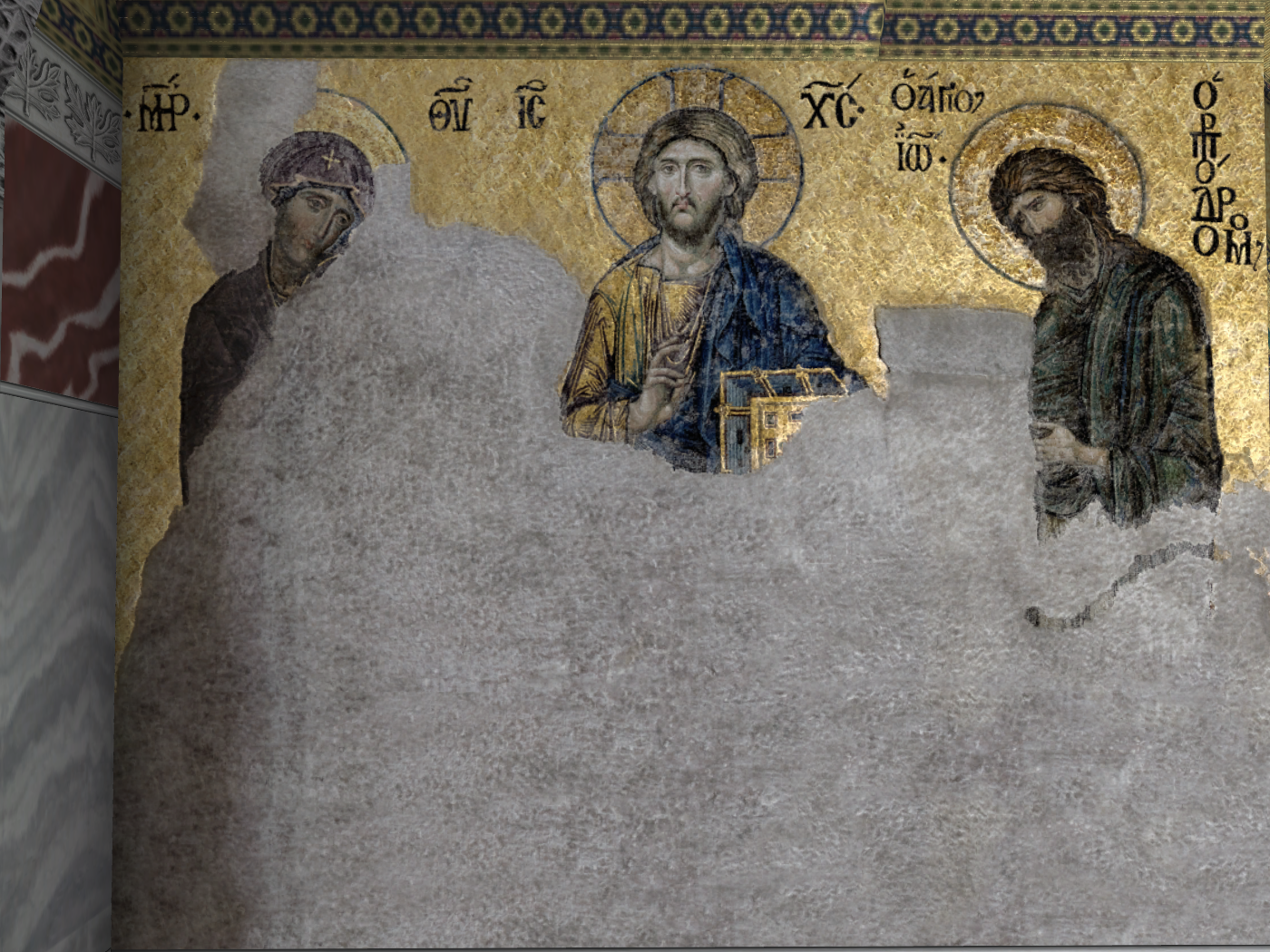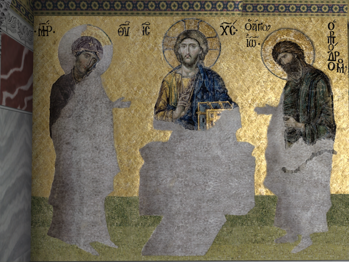 Δέηση στο νότιο υπερώο. (εικόνες 60, 61 και 62) Το ωραιότερο κατά πολλούς ψηφιδωτό του ναού. Βρίσκεται στον δυτικό τοίχο του νότιου υπερώου στο ύψος των ματιών. Στη μέση στέκεται ο Χριστός ένθρονος, στα δεξιά του η Θεοτόκος και στα αριστερά του ο Άγιος Ιωάννης ο Βαπτιστής. Το κάτω μέρος είναι κατεστραμμένο, αλλά το αρχικό ύψος των προσώπων θα ήταν περίπου 4,00μ. Ο Χριστός ευλογεί και από τα χαρακτηριστικά του προβάλλει η εσωτερική ειρήνη. Η Θεοτόκος γέρνει ελαφρά το κεφάλι γεμάτη χάρη προς το μέρος του Υιού της, ενώ ο Ιωάννης κοιτάει προς το μέρος τους με αυστηρότητα. Το ολόχρυσο φόντο φωτίζει τα πρόσωπα με εσωτερικό φώς. Τα πρόσωπα του Χριστού και της Παναγίας φωτίζονται με μικρές πινελιές, ενώ του Ιωάννη με βαθύχρωμες ψηφίδες που υποδηλώνουν τους μύες κάτω από το δέρμα. Και οι δύο τεχνικές παρατηρούνται στην Αγία Σοφία, η πρώτη στο πορτρέτο του Αλέξιου Κομνηνού, ενώ η δεύτερη στα πρόσωπα των αυτοκρατόρων στην νότια είσοδο.