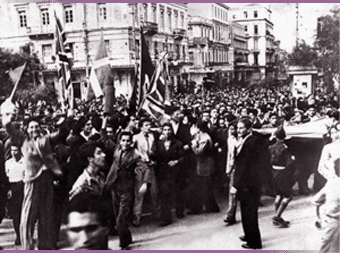 The crowd, gathered at the centre of Athens, is rejoicing over the declaration of the Greek-Italian war.