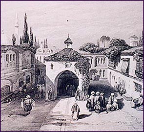 Πολλοί Έλληνες που εγκαταστάθηκαν στο Βελιγράδι κατάγονταν από την Αδριανούπολη της Θράκης. Εδώ: 'Aποψη της "πλατείας της κρήνης" στην Αδριανούπολη, 1830.