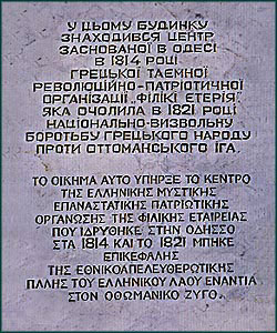 Η Φιλική Εταιρεία ιδρύθηκε στην Οδησσό στις 14 Σεπτεμβρίου 1814 από τρεις έλληνες εμπόρους παροίκους, τους Ν. Σκουφά, Ε. Ξάνθο και Α. Τσακάλωφ. Εδώ: Η εντοιχισμένη μαρμάρινη πλάκα από το σπίτι της Φιλικής Εταιρείας στην Οδησσό.
