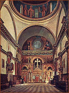 Η ελληνική Αδελφότητα της Βενετίας απέκτησε τη δική της εκκλησία μόλις το 1573, οπότε ολοκληρώθηκε ο ελληνορθόδοξος ναός του Αγίου Γεωργίου, στον οποίο το μεγαλύτερο μέρος του εικονοστασίου φιλοτέχνησε ο κορυφαίος κρητικός αγιογράφος Μιχαήλ Δαμασκηνός. Εδώ: 'Aποψη του εσωτερικού του ναού του Αγίου Γεωργίου Βενετίας.
