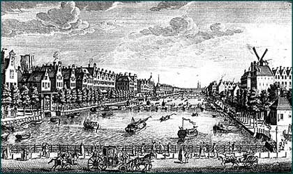 Οι Έλληνες οι οποίοι εγκαταστάθηκαν μόνιμα στο 'Aμστερνταμ και δημιούργησαν την ελληνική παροικία εκεί ήταν κυρίως έμποροι και κάποιοι μικρομαγαζάτορες. Εδώ: 'Aποψη του 'Aμστερνταμ με τον ποταμό Amstel περίπου την εποχή της δημιουργίας της ελληνικής παροικίας, 1720.